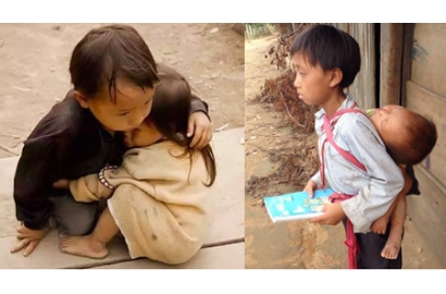 Tấm hình chụp một em bé ở Quảng Nam địu em ở trước ngực khi tới lớp học khiến rất nhiều người xúc động. Trước mặt em là những trang sách đã nhàu nát đang mở ra theo bài giảng của thầy giáo, hai tay em ôm chặt em trai trong lòng còn đôi mắt đang chăm chú theo từng nét chữ thầy dạy. Muốn thực hiện ước mơ được cắp sách tới trường nhưng không thể bỏ em trai mới 8 tháng tuổi ở nhà một mình, cô bé đã dùng tất cả sức lực địu em vượt qua một chặng đường rất dài. Cô bé nhỏ nhắn nhưng sự cứng cỏi và quyết tâm của em không hề khiêm tốn một chút nào. Trong ánh mắt chăm chú của em, qua vòng tay ấm áp đang ôm em trai bé nhỏ của em, chúng ta như đọc được lời tâm sự từ tận đáy lòng cô gái nhỏ ấy “Chị không thể từ bỏ ước mơ được tới trường, nhưng chị lại càng không thể bỏ rơi em trai yêu quý của chị.”