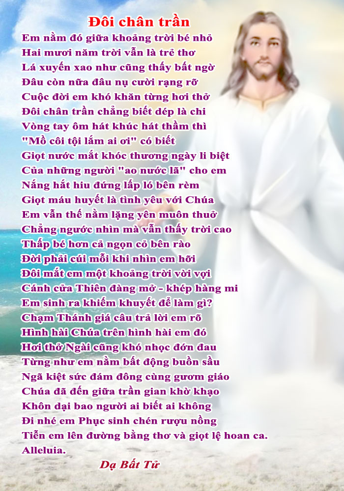 Chúng tôi vừa nhận được bài thơ viết cho người bạn nhỏ khuyết tật, tại mái ấm Nguyệt Biều (Huế) vừa qua đời. Lời thơ là tiếng nói từ trái tim đồng cảm, yêu thương, và cũng là lời tiễn biệt, gởi gắm cho Trái tim nhân hiền của Chúa, cùng cầu chúc bạn nhỏ hưởng trọn Niềm Vui Hạnh Phúc trong Đấng Phục Sinh, sau bao đau khổ đã cùng cộng tác với Chúa trên dương thế này.