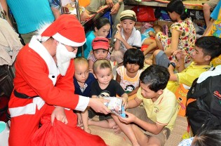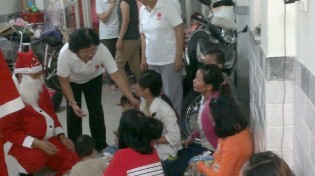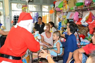 Tiếp theo, vào chiều ngày 26/12/2013, ban Caritas giáo xứ đến với khoa Nhi của Trung Tâm Ung bướu - Tp HCM để tặng quà cho các em đang điều trị bệnh tại đây. Hiện nay, khoa Nhi có tất cả 180 em điều trị nội trú, trong đó có những em mắc bệnh rất nặng và điều trị vô cùng tốn kém. Hầu hết các em đều thuộc các địa phương xa xôi, việc di chuyển khá là phức tạp. Do đó, vào những dịp Lễ, Tết các em không được hưởng không khí vui vẻ như bao bạn bè khác, rất thiệt thòi. Chính vì thế, việc thăm hỏi, động viên các em chính là tạo niềm vui và hy vọng, giúp các em bớt đi nỗi đau bệnh tật đang hành hạ các em. Với những phần quà là hộp bánh, những chú gấu bông xinh xắn, các em còn được tận mắt xem thấy Ông già Noel đến tận giường trao cho các em quà Giáng sinh. Có những phụ huynh của các bệnh nhi không cầm được nước mắt.