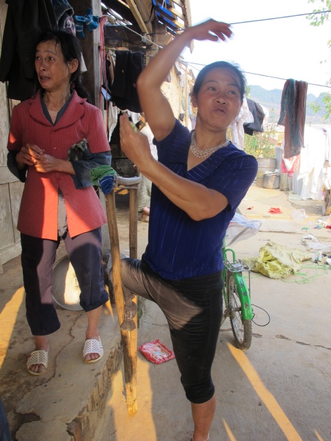 | Lồ Thị Pà đang cố gắng nói chuyện với khách bằng ngôn ngữ riêng của mình |