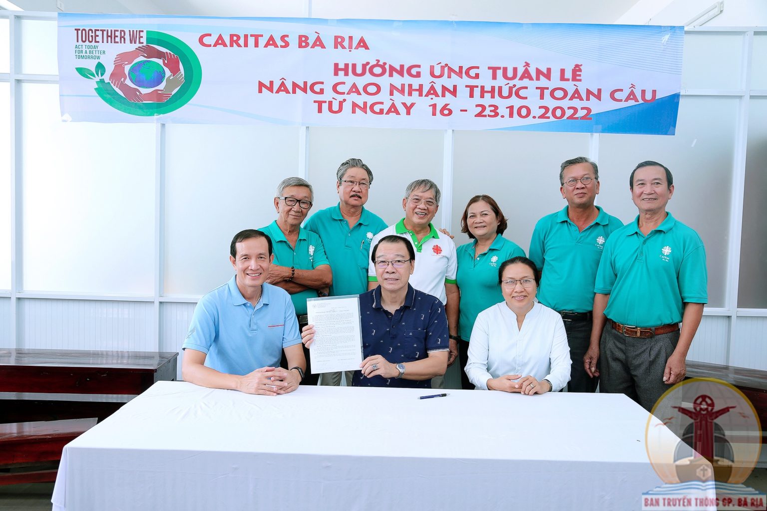 Tiếp đó, Cha giám đốc Caritas Bà Rịa mời gọi hội viên Caritas Việt Nam thuộc các giáo hạt, các giáo xứ trong giáo phận tích cực hưởng ứng Tuần lễ Nâng cao nhận thức toàn cầu bằng những hoạt động cụ thể, thiết thực. Sau đó, lần lượt đại diện Ban Điều hành Caritas 5 giáo hạt, Cha Giám đốc, phó Giám đốc Caritas Bà Rịa và đại diện Ban chiến dịch ký tên vào bản Giao kết hưởng ứng chiến dịch “Togheter We – Chúng ta cùng nhau”.