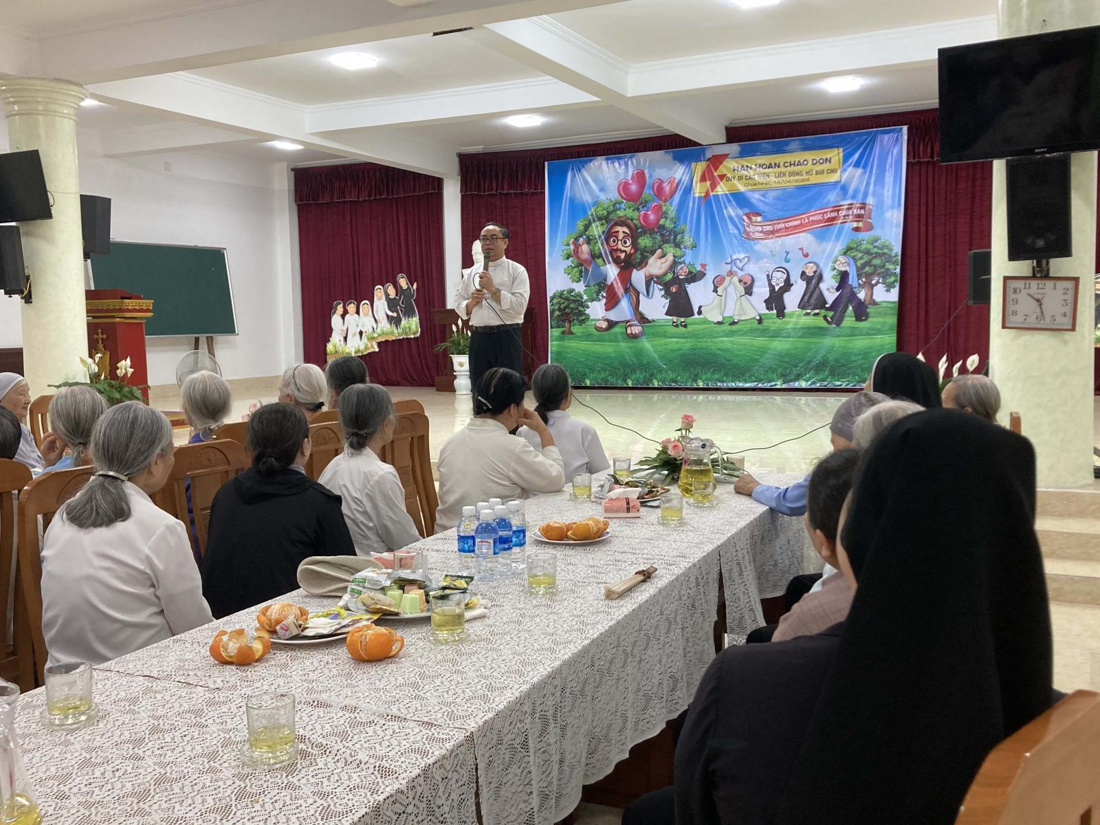 Tiếp theo đó, Cha giám đốc Gioan Baotixita Mai Quang Tuyến đã có những lời chia sẻ với cộng đoàn nhân dịp gặp gỡ. Và mời gọi cộng đoàn cùng chia sẻ hiệp thông và liên đới với nhau trong lời cầu nguyện. Cha gợi ý muốn lấy ngày 14.04 hằng năm là ngày truyền thống Caritas tổ chức cho quý Dì cao niên của 5 hội dòng giao lưu gặp gỡ.