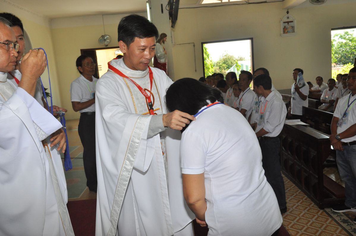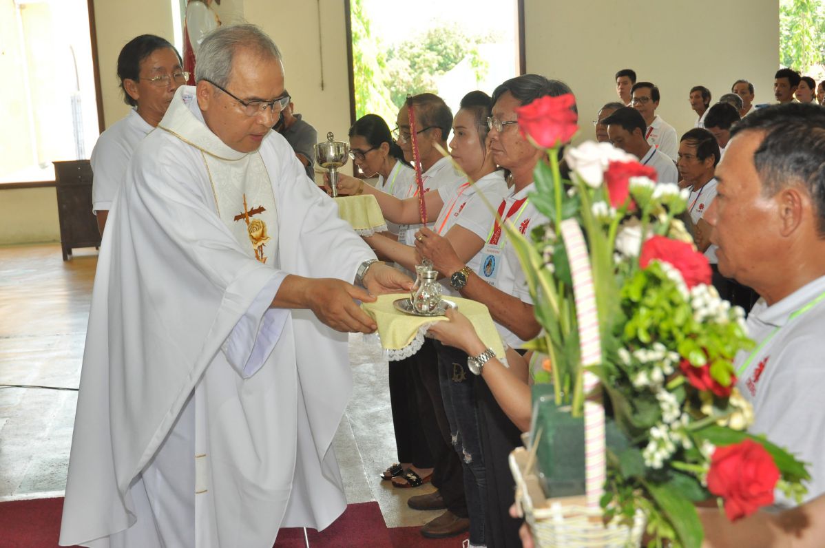 Đến 8 giờ 45, cộng đoàn cùng tham dự Thánh lễ Tạ ơn do cha giám đốc Caritas chủ tế; cha phó giám đốc đồng tế. Đọc bài Tin Mừng ngày lễ Đức Mẹ đi thăm viếng bà Ê-li-sa-bet (Lc1,39-56), cha Simon đề cao tâm tình ngạc nhiên của bà Elisabeth đối với Mẹ: “Bởi đâu tôi được Thân Mẫu Chúa đến với tôi thế này” (c.43). Cùng với người chị họ Đức Mẹ, hội viên Caritas cần nhận ra biết bao nhiêu cái “bởi đâu tôi được” trong đời sống … Là hội viên, họ phải nói lên tâm tình tri ân: bởi đâu tôi được Thiên Chúa sai đi phục vụ người nghèo, để biết sẵn sàng chia sẻ thì giờ, hy sinh công sức tiền của cho tha nhân. Sau bài giảng có nghi thức gia nhập Caritas Việt Nam và trao thẻ cho 32 hội viên mới.