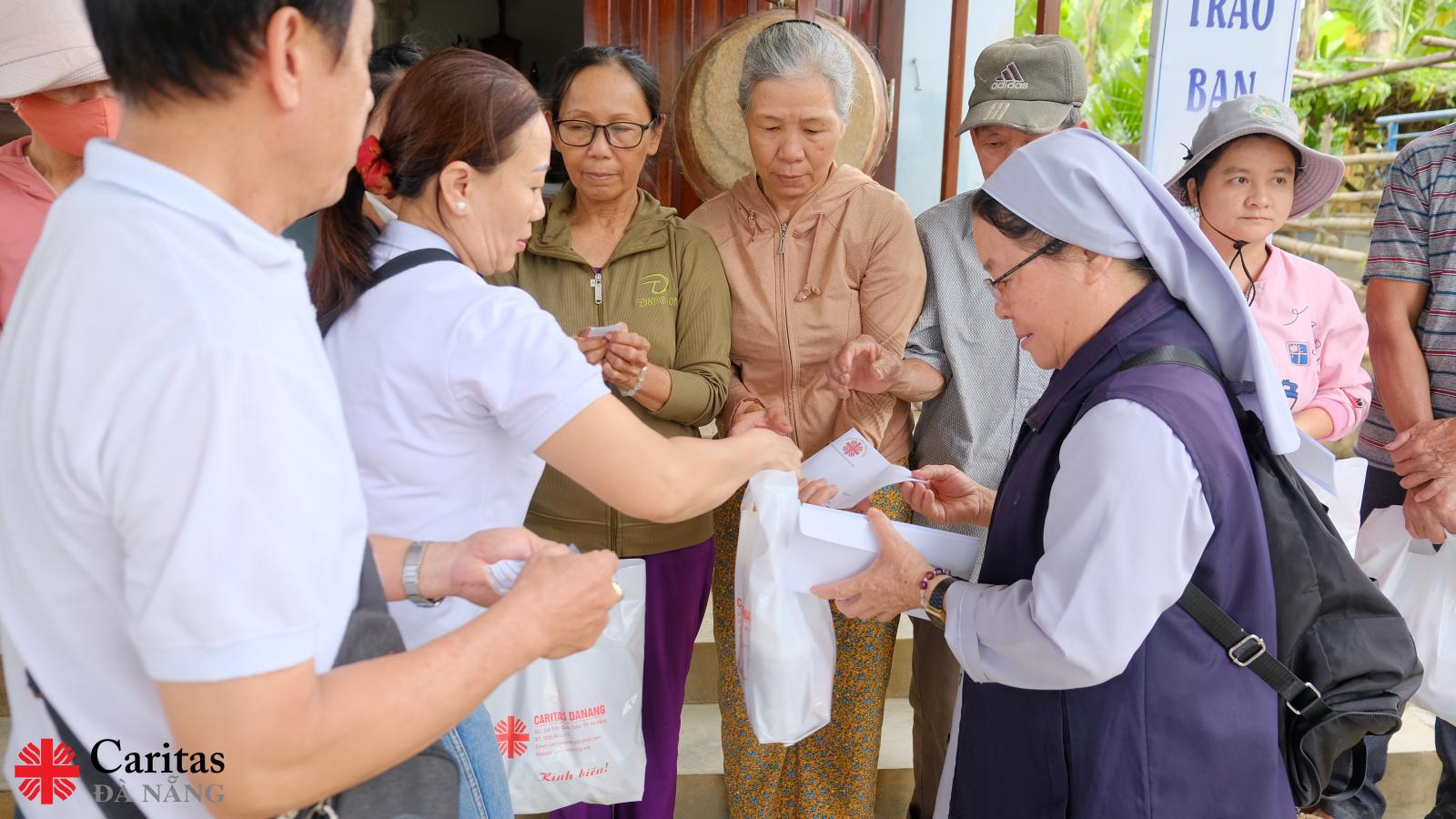 Tại thôn Ga Doong và các thôn thuộc xã Sông Vàng (huyện Đông Giang cũ), Cha Simon – Giám đốc Caritas Đà Nẵng – cùng Đức Tổng Giám mục Giuse Ngô Quang Kiệt đã trực tiếp đến thăm và trao quà cho 74 gia đình người dân tộc Cơtu. Bà con được lựa chọn những nhu yếu phẩm cần thiết tại phiên “Siêu thị 0 đồng” đầy ấm áp nghĩa tình.
