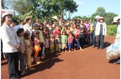 Bà con dân tộc đã có mặt từ sớm. Những em bé quần áo nhếch nhác với khuôn mặt hồn nhiên, đôi mắt to đen nhánh lộ vẻ đơn sơ của người con núi rừng, rất thích thú khi nhận những gói bánh kẹo đầy mầu sắc. Người lớn vui mừng vác những túi gạo, thực phẩm khô. Mỗi phần quà trị giá 250.000đ và một gói quần áo.