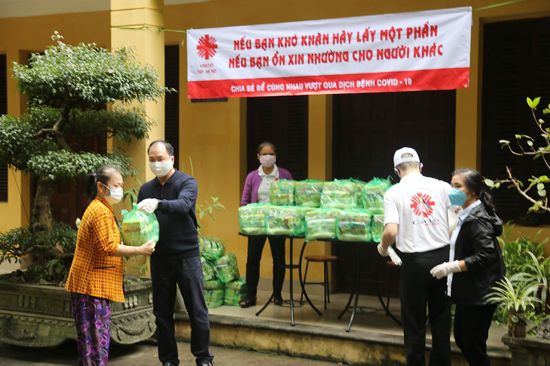 Trong thời gian vừa qua, đã có rất nhiều người lao động rơi vào cảnh túng thiếu do đại dịch Covid-19 gây ra. Đứng trước thực trạng đó, Caritas Hà Nội đã có nhiều hình thức đồng hành cùng những anh chị em khó khăn như tặng gần 2000 xuất quà cho các hộ gia đình, đặt quầy hàng tặng các nhu yếu phẩm cần thiết tại Giáo xứ Hà Đông và Tòa Giám Mục.