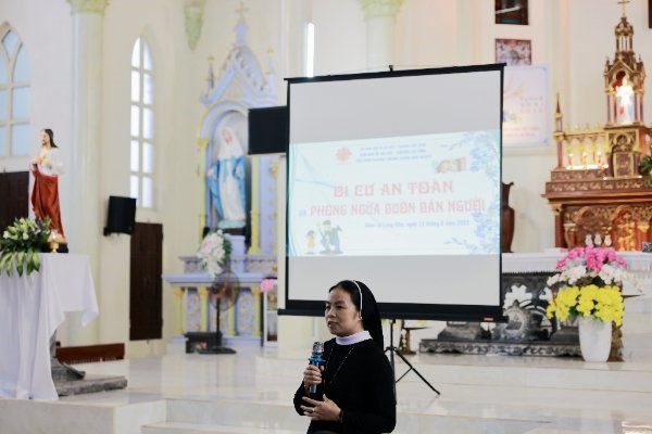 Tiếp đến Sr. Linh Nga trình bày cho các TDV tổng quan về buôn bán người ở Việt Nam. Đồng thời hướng dẫn cho mọi người kỹ năng về PCBN qua các yếu tố như dấu hiệu nhận biết thủ phạm, nhận biết nạn nhân và những thủ đoạn của những kẻ buôn bán người. Bên cạnh đó cũng gửi tới các TDV tờ bướm thông tin cần thiết về PCBN.
