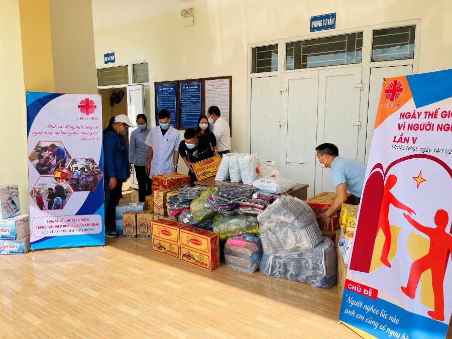 Chung tâm tình và ý hướng với vị Cha chung, sáng Chúa nhật 14/11 hôm nay, Văn phòng Caritas Hải Phòng đã tổ chức chuyến thăm và trao quà cho các bệnh nhân tại Trung tâm Điều dưỡng người Tâm thần Vĩnh Bảo (Hải Phòng). Nơi đây đang nuôi dưỡng và điều trị cho khoảng 400 bệnh nhân. Họ chính là người nghèo nhất trong số những người nghèo.