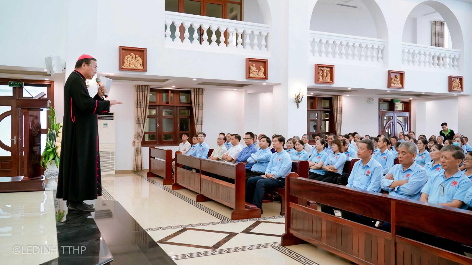 Hồi 09g30, Quí hội viên từ các giáo xứ, giáo hạt đã qui tụ về Nhà nguyện của Trung tâm mục vụ để lắng nghe Đức cha giáo phận huấn đức. Vị chủ chăn vui mừng trước sự hiện diện đông đảo của các hội viên Caritas. Chia sẻ với anh chị em hội viên, Đức cha nhắc nhở mọi người cần ý thức về tầm quan trọng của các công việc bác ái mình đang làm là nhân danh Giáo hội, các công việc đó khác với các việc bố thí, từ thiện của các tổ chức khác. Đức cha mong muốn các hội viên hãy nhiệt tình dấn thân cho các công việc ý nghĩa này, như một cách làm sinh lời các nén bạc mà Chúa đã ban cho mỗi người. Các công việc bác ái đó cũng cần làm một cách khoa học, minh bạch, xứng với sự tin tưởng mà các nhà tài trợ đã gửi gắm.