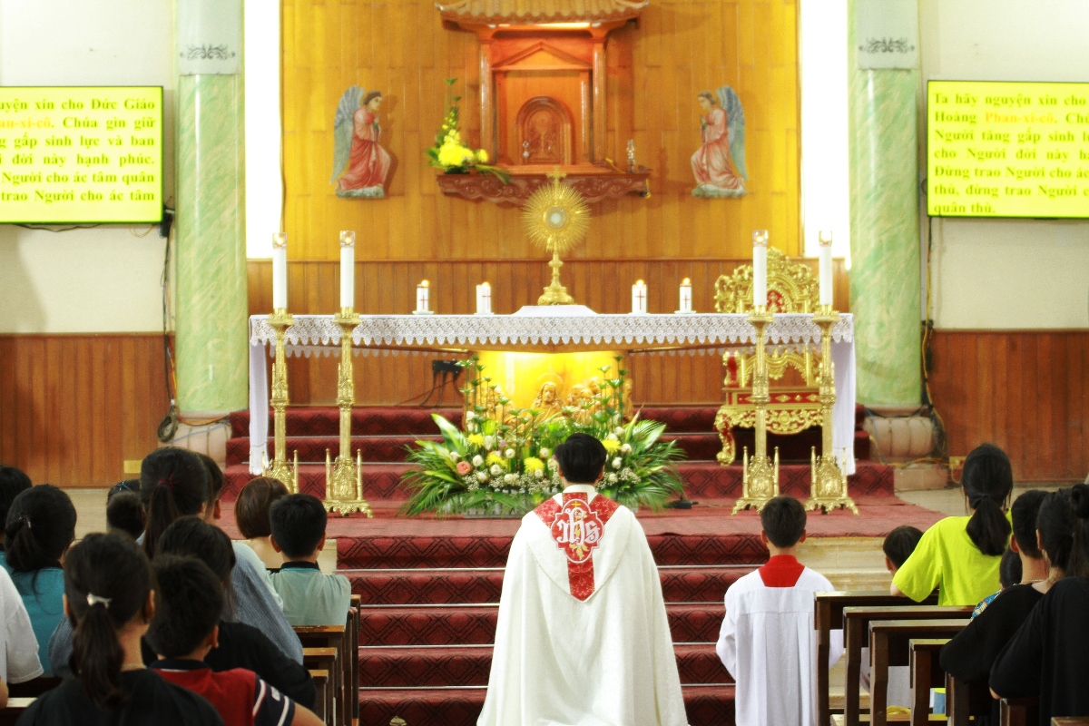 Trong giờ chầu Thánh Thể mở đầu ngày gặp gỡ, cha Gioan B. Nguyễn Văn Hải - chính xứ Hội Am, đồng thời là cha đặc trách Caritas giáo hạt Nam Am đã dâng các tham dự viên nhí lên Chúa và nài xin Chúa chúc lành cho các em, không chỉ trong ngày gặp gỡ, mà trong suốt cuộc sống, hành trình học tập của các em.
