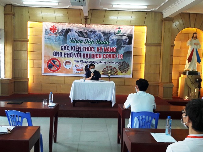 Hiện diện trong buổi tập huấn có cha Giám đốc, cha Phó Giám đốc Caritas Hải Phòng, cha đặc trách Caritas hạt Hòn Gai và Mạo Khê, đại diện Mặt trận Tổ quốc Hải Phòng và các hội viên Caritas của 6 Giáo hạt trong Giáo phận cùng một số sinh viên ngành y. Giảng viên là TS. BS Nguyễn Quang Chính - Giám đốc Trung tâm Truyền thông giáo dục sức khỏe Thành phố Hải Phòng. Điều đặc biệt dễ nhận thấy là tất cả mọi người tham dự khóa tập huấn, từ Quý cha, Quý khách, giảng viên đến các học viên đều mang khẩu trang. Trước đó, phòng hội TGM đã được phun thuốc khử khuẩn, các tham dự viên đều vệ sinh tay bằng dung dịch sát khuẩn và được đo thân nhiệt trước khi vào phòng.