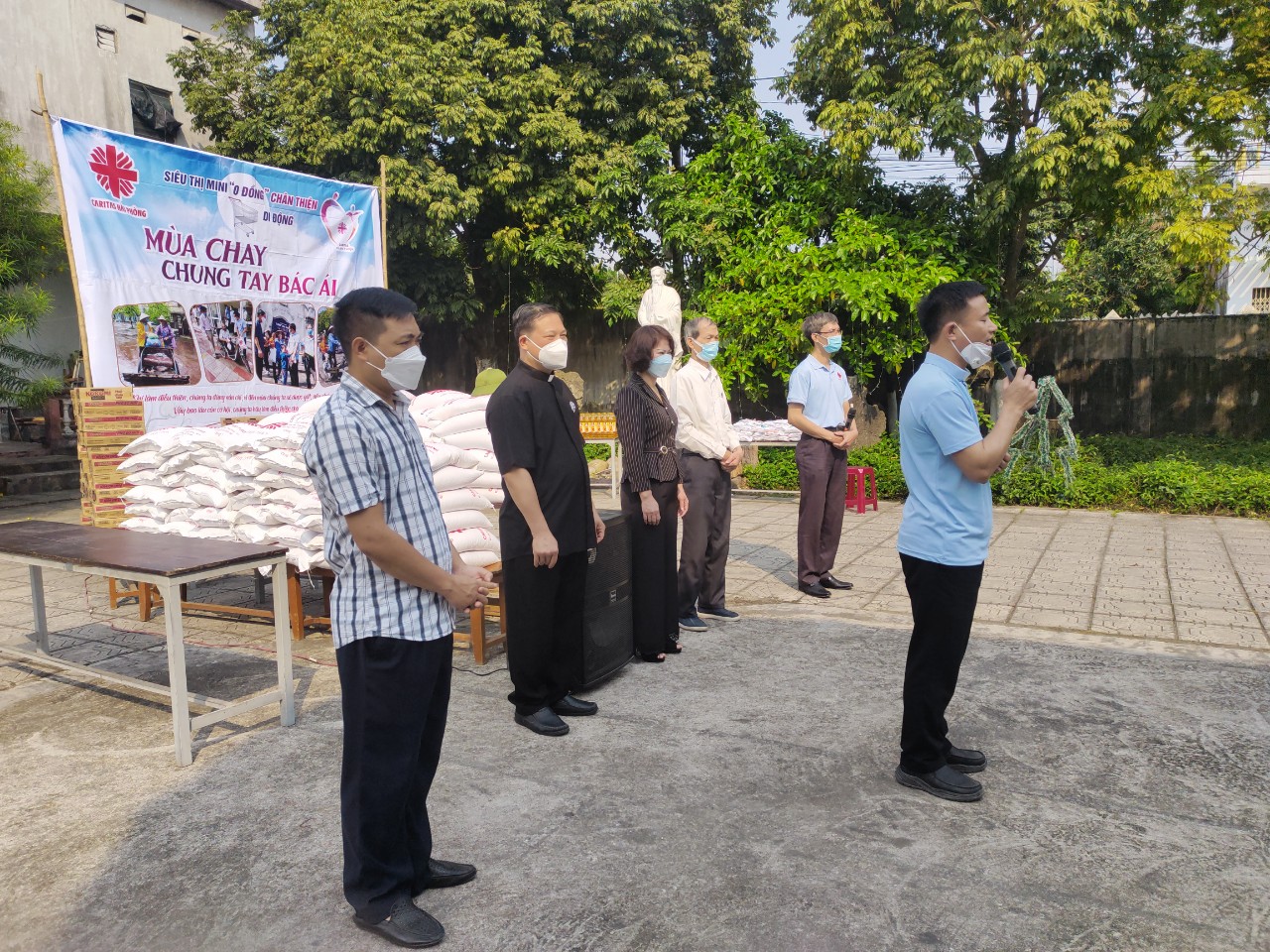 Trước khi chương trình “Phiên chợ 0đ” bắt đầu, quý cha và các hội viên Caritas đã cất cao lời Kinh Lạy Cha để xin phúc lành của Thiên Chúa tuôn đổ xuống trên mọi người.