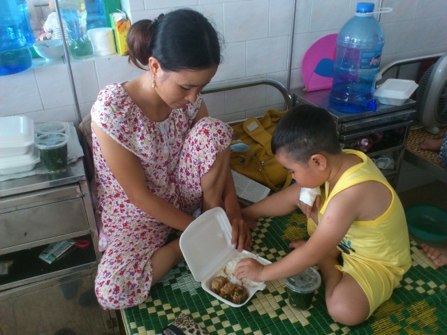 Chúng tôi đến bệnh viện trẻ em Hải Phòng vào buổi trưa ngày hè oi ả, ngày mà Caritas Hải Phòng có chương trình trao những phần cơm, cháo cho những bệnh nhân nhi nghèo, bệnh nặng, đến từ Hải Phòng và các tỉnh lân cận như Hải Dương, Quảng Ninh, Thái Bình…