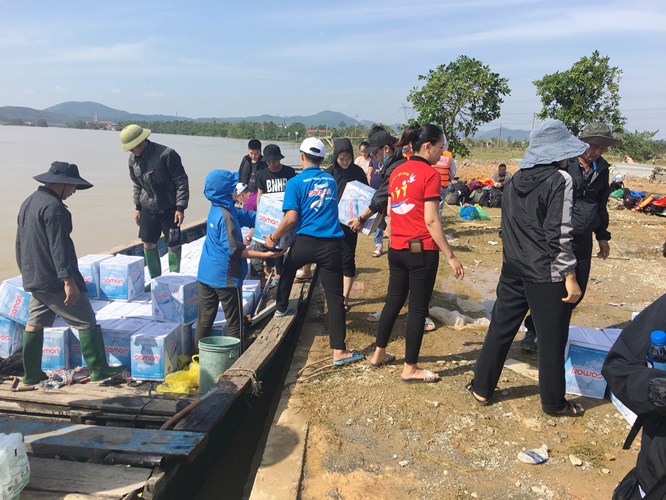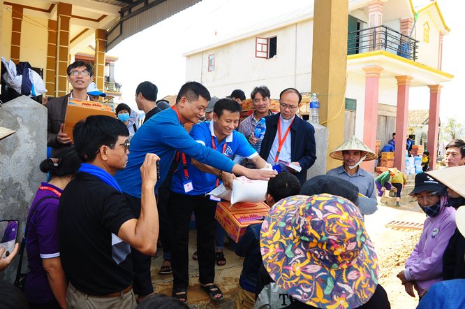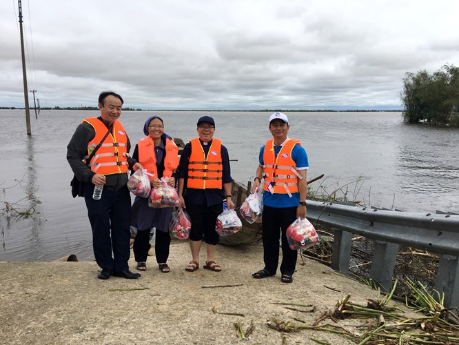 Đồng hành cùng Ban Caritas, có cha Phêrô Sanen Nguyễn Văn Hiệu - đặc trách Caritas liên hạt Chính Toà + Nam Am, cha Giuse Bùi Xuân Thắng - chính xứ Mỹ Động, quý sơ Dòng Mến Thánh Giá, quý sơ Tu hội Emmanuel và trên hai chục thiện nguyện viên. Phái đoàn đến chia sẻ tình yêu thương cho Miền Trung không chỉ với tâm tình cá nhân, mà còn mang theo tấm lòng của gia đình Giáo phận Hải Phòng, nhất là lòng hảo tâm của quý Ân nhân gửi gắm qua sự ủng hộ, quyên góp. Tình cảm sâu nặng ấy cùng với cảnh “vượt dặm trường” dường như làm cho nghĩa tình thêm đậm đà, yêu thương như đong đầy.