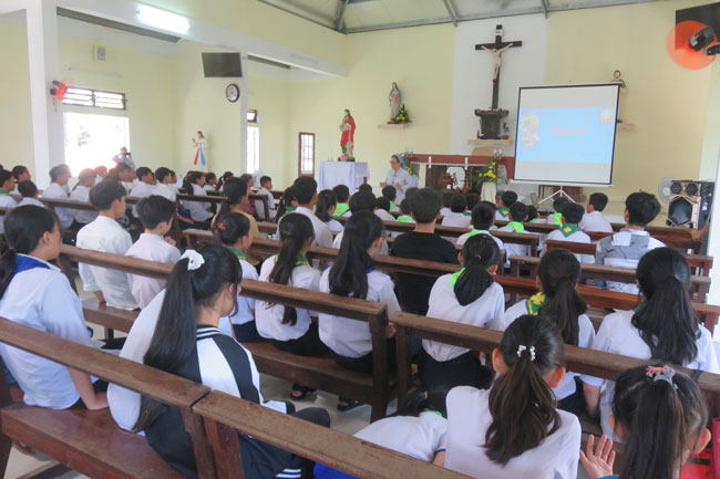Làm sao để sống vui? Sơ Trà Ảnh chia sẻ: sống vui có được khi các em biết trao ban, trao nụ cười, trao yêu thương, trao chính sự từ tâm của mình và để được thế các em cần nổ lực tập luyện, phát triển bản thân, sống hài hòa với người khác. Các em được xem video về những con người sống kiên cường; các em có trải nghiệm về hạt giống trong cuộc sống đời thường, thì cũng thế, để có một đức tính tốt cần phải gieo trồng, chăm sóc, vun quén ngay từ hôm nay.