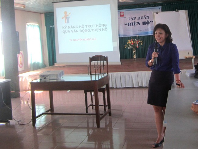 Tiến sĩ Hoàng Lan diễn giải theo trình tự năm quy trình biện hộ, để giúp học viên sau tập huấn có thể thành những “chuyên viên” về thu thập thông tin, phân tích dữ liệu, lập kế hoạch, thực hiện, giám sát và lượng giá.