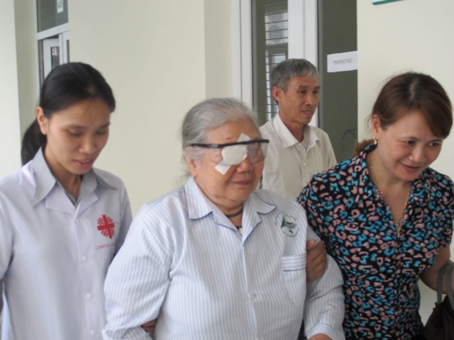 | Nhân viên Caritas hướng dẫn bệnh nhân sau mổ mắt |