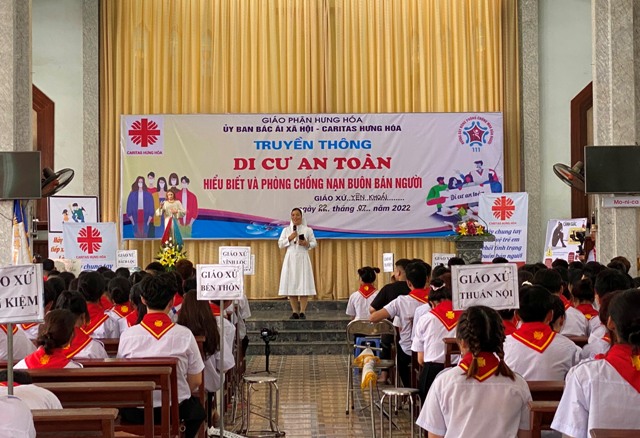 WGPHH - Ngày 22.07.2022, tại giáo xứ Yên Khoái đã diễn ra chương trình mừng lễ quan thầy và kỷ niệm 5 năm thành lập Hiệp đoàn Đaminh Sơn Tây. Nhân dịp này, Ban Bác ái Xã hội – Caritas Hưng Hóa đã kết hợp với Ban điều hành Hiệp đoàn Thiếu nhi Thánh Thể giáo hạt Sơn Tây, để truyền thông cho các bạn huynh trưởng, dự trưởng về Di cư an toàn, hiểu biết và phòng chống nạn buôn bán người. Hiện diện trong buổi truyền thông có quý cha, quý thầy, quý dì trợ úy đang hoạt động trong Phong trào Thiếu nhi Thánh Thể tại các giáo xứ trong giáo hạt; nữ tu Maria Trần Thị Bích Trâm – thành viên Caritas Việt Nam; cha Giuse Đỗ Văn Kiêm và quý dì Caritas giáo phận; cùng với hơn 600 huynh trưởng và dự trưởng trong Hiệp đoàn Đaminh Sơn Tây.