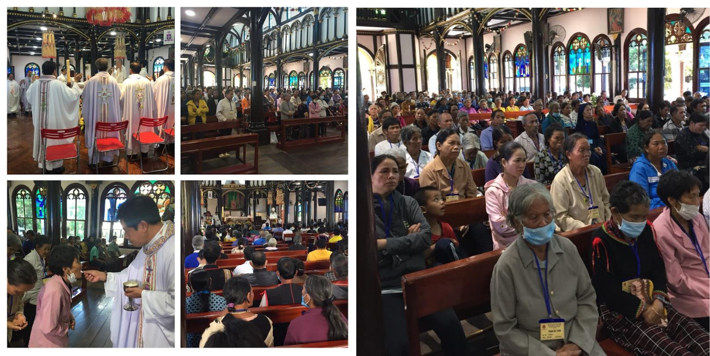 9 giờ 30 tất cả TDV và khách quý cùng được mời gọi vào gặp gỡ Chúa, trong tinh thần Cũng cố sự hiệp thông nhằm nâng đỡ nhau trong cuộc sống YÊU THƯƠNG-PHỤC VỤ. Với những chia sẻ từ thực tiễn kinh nghiệm phục vụ BNP và những kiến thức hiểu biết về bệnh phong của đại diện các điểm các cộng đoàn đang phục vụ, Cha Giám đốc đúc kết và nhắc nhở mỗi BNP cần hiểu đúng và thực hiện nếp sống, sinh hoạt phù hợp để cải thiện đời sống nhất là chú ý tương trợ, giúp đỡ lẫn nhau trong hoàn cảnh bệnh tật của mình. Đặc biệt qua tâm tình sẻ chia, Đức Cha Aloisiô đã ân cần nhắn nhủ: BNP cần nhận ra mình là người luôn được sự quan tâm của rất nhiều người, bằng chứng là những món quà vật chất hay tinh thần mà các ân nhân gần xa gởi trao qua những cánh tay nối dài là Ban Caritas, các Cha, các Soeur, các Tình nguyện viên thuộc các cộng đoàn trong giáo phận.