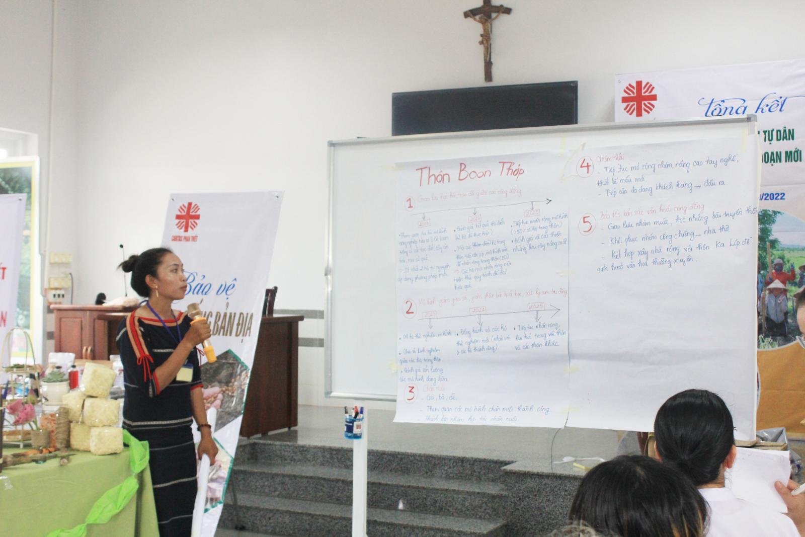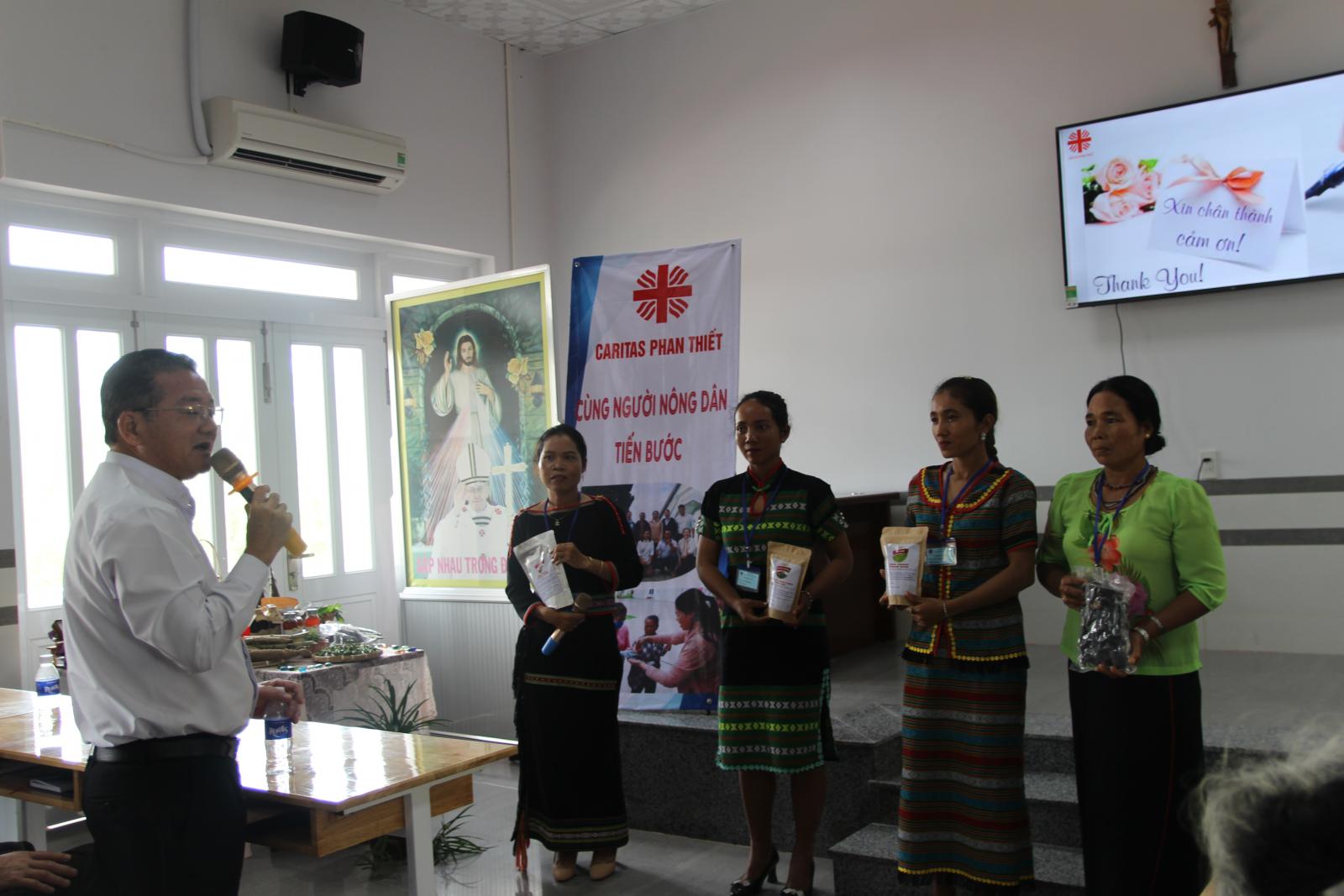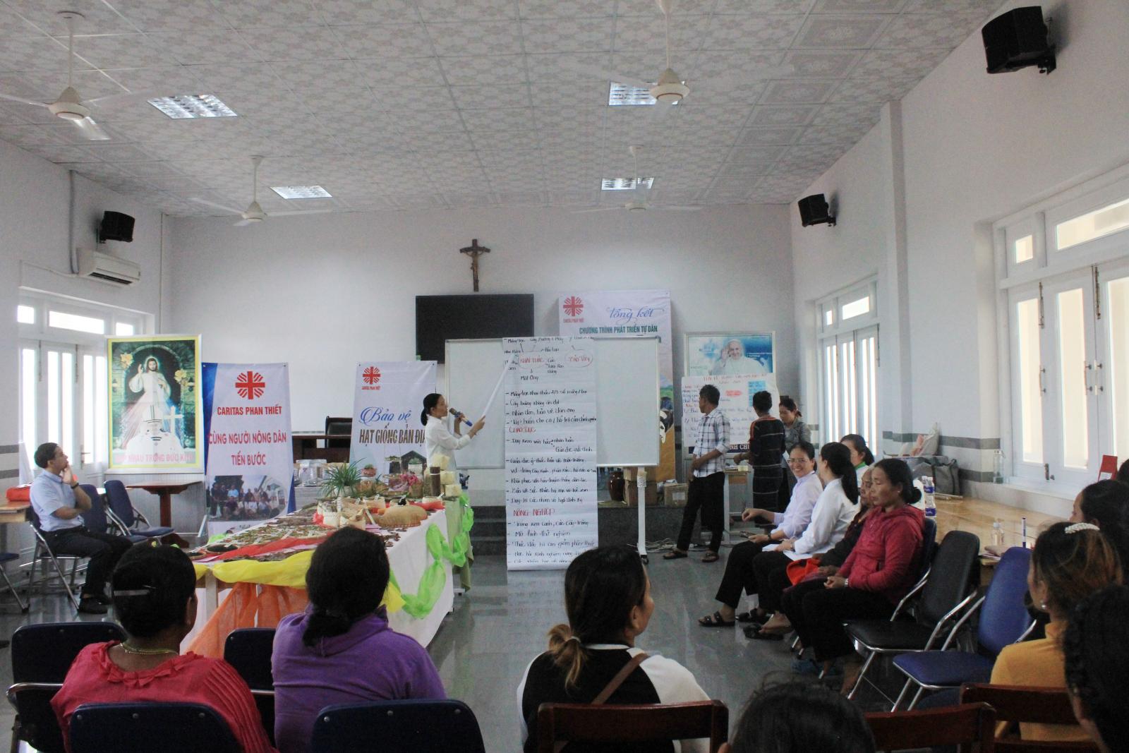 Tiếp sau phần khai mạc, Soeur Ngô Thị Vân – Quản lý dự án đã trình bày tổng quan về dự án và những kết quả đã đạt được từ những cố gắng của biết bao nhiêu người, cũng như những bài học kinh nghiệm trong quá trình thực hiện, sự kiên nhẫn của nhân viên cộng đồng, và những nỗ lực của Quý Soeur Caritas Phan Thiết. Bên cạnh những thuận lợi, dự án vẫn vướng phải rất nhiều khó khăn, chẳng hạn như: về tôn giáo, về chính quyền, trình độ, chuyên môn… Sau phần báo cáo tổng quan, các thôn lần lượt lên trình bày về câu chuyện của cộng đồng mình, chia sẻ những mong muốn và các nhu cầu của thôn làng để chuẩn bị cho giai đoạn mới. Cũng trong phần trình bày này, các thôn có những khoảng thời gian để giới thiệu các đặc sản của chính cộng đồng mình và được chính tay bà con làm nên như làng Sông Phan có sản phẩm mật ong rừng, măng khô; Suối Máu vẫn còn những sản phẩm truyền thống như đũa buông; Phan Sơn có các sản phẩm về măng khô, các loại đậu, mè đen…. Niềm vui được thể hiện rõ trên chính nụ cười, khuôn mặt của từng nông dân vì họ được hãnh diện với những gì họ làm. Tất cả nông dân đều ước mong tìm được nơi tiêu thụ các sản phẩm của họ để giúp cải thiện đời sống kinh tế của người dân.