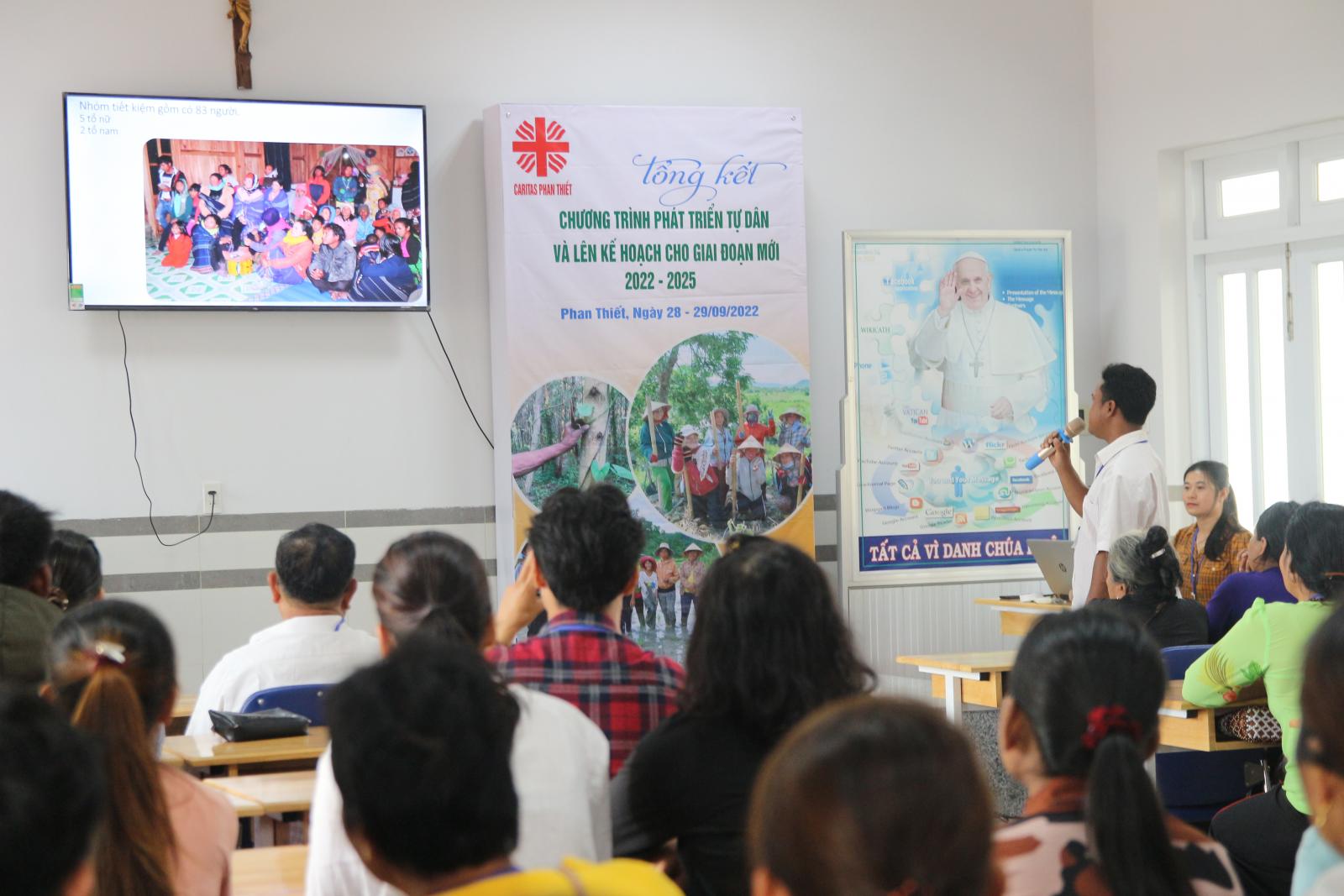 Vào ngày 28-29/09/2022 vừa qua, Caritas Phan Thiết đã tổ chức “Tổng kết Chương trình phát triển tự dân (2020-2022) và lên kế hoạch cho giai đoạn mới (2022-2025)” tại giáo xứ Rạng (322/12 Nguyễn Đình Chiểu, p. Hàm Tiến, Tp. Phan Thiết). Với sự hiện diện của Quý Cha: Giuse Nguyễn Hữu An - Phó Giám Đốc Caritas Phan Thiết; Giuse Vũ Công Danh, O.P – Đại diện Caritas Việt Nam; Phêrô Trần Thiện Khuê – Đặc Trách Caritas Hạt Bắc Tuy; Phêrô Lê Trọng Tạo – Đặc trách Caritas Hạt Phan Thiết, cùng quý khách mời: Caritas Đà Lạt, Caritas Long Xuyên, các anh chị trong Chương trình phát triển lâm sản ngoài gỗ (NTFP -EP Việt Nam). Và thành phần quan trọng không thể thiếu đó là sự hiện diện đông đảo của 70 anh chị em nông dân thuộc các thôn Tân Quang – Xã Sông Phan, Suối Máu – xã Tân Hà, Boon Thớp và Kalip – Xã Phan Sơn và Tổ 1, 2 xã Phan Lâm.