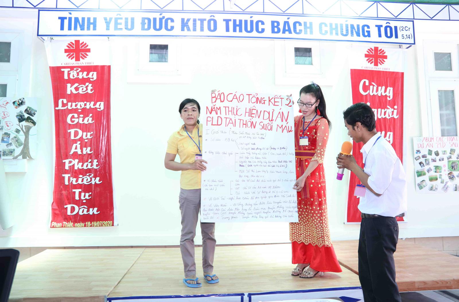 Chương trình được tiếp tục với việc báo cáo tổng quát của Ban Quản lý dự án sau hai năm thực hiện. Soeur Maria Ngô Thị Vân, đại diện cho Ban Caritas Phan Thiết bày tỏ niềm vui khi nhìn thấy được những thành quả qua những cố gắng của những người nông dân, sự kiên nhẫn của nhân viên cộng đồng cũng như những nỗ lực hết mình của Quý Soeur Caritas Phan Thiết. Bên cạnh đó, dự án vẫn gặp rất nhiều khó khăn: về tôn giáo, về chính quyền, trình độ, chuyên môn…..Sau phần báo cáo, các thôn cùng nhau lên kế hoạch cho thôn làng của mình trong ba năm sắp tới. Những kế hoạch được vạch ra một cách cụ thể, và dựa trên những gì người dân đã có để phát triển vững mạnh, giúp cho bộ mặt buôn làng có thể “thay da đổi thịt” trong tương lai.