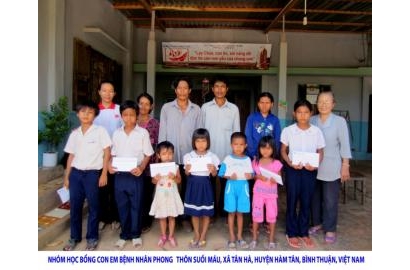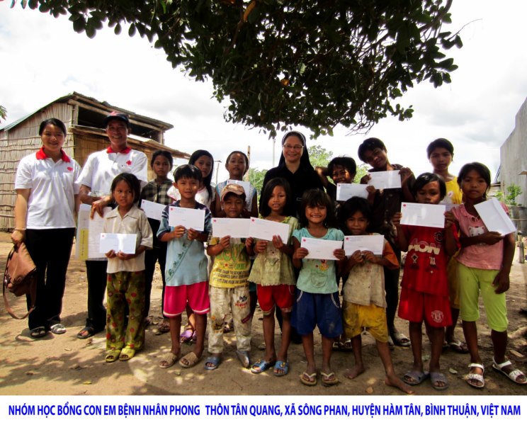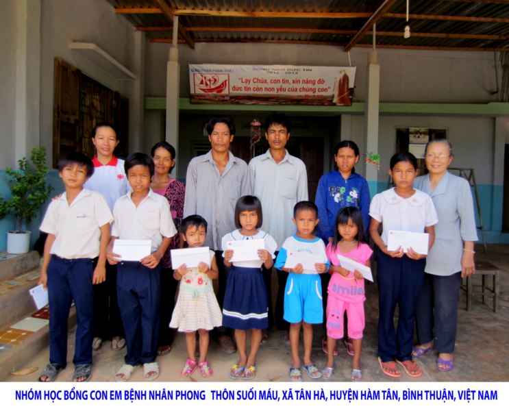 Trong niên khoá 2012-2013, tháng 5/ 2013, Ban BAXH – Caritas Phan Thiết đã đến trao tiền hỗ trợ học phí 39 triệu đồng của Hội Damien cho 21 học sinh là con em của bệnh nhân phong đều thuộc huyện Hàm Tân, Bình Thuận. Trong số đó, 14 học sinh ở làng phong thôn Tân Quang, xã Sông Phan do soeur Ngọc (dòng MTG Phan Thiết) phụ trách và 7 học sinh ở làng phong thôn Suối Máu, xã Tân Hà do soeur Tuyết (Tu Hội Thừa Sai Bác Ái) đảm nhiệm. Số tiền được trao sớm cho người phụ trách để phụ huynh an tâm cho các em được đi học tiếp trong năm học sắp tới.