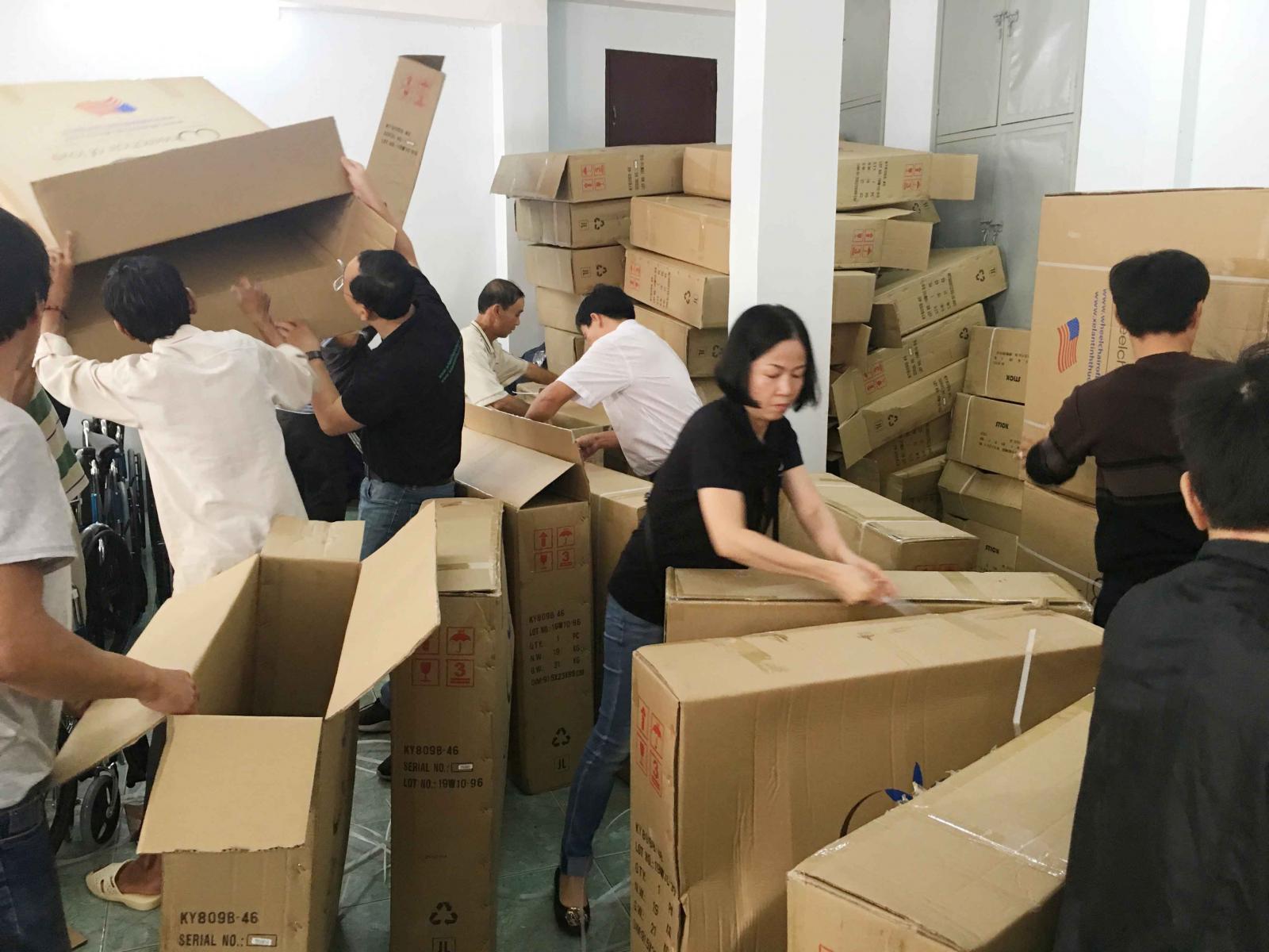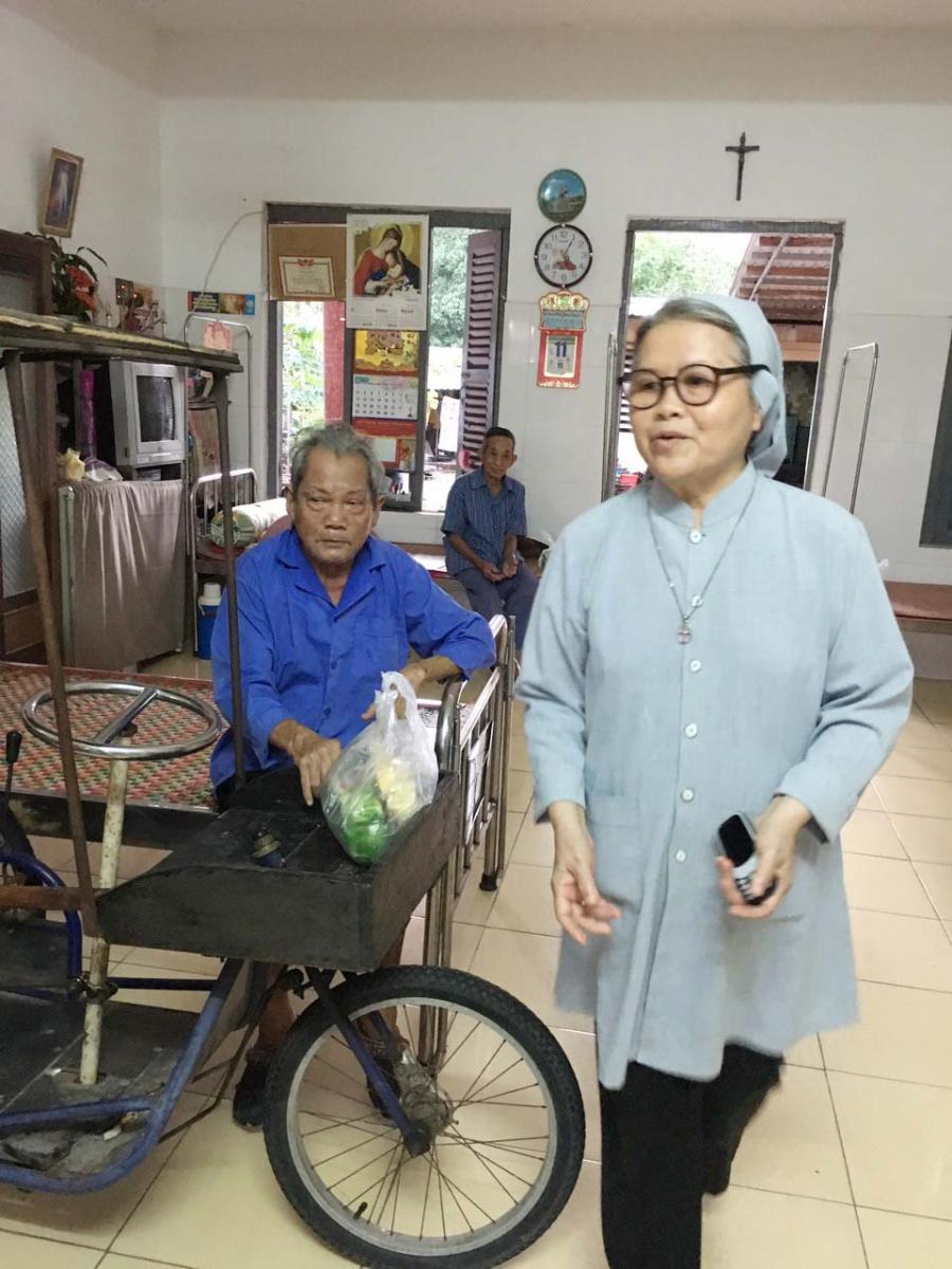 Thay vào đó, chúng tôi đã được sự chào đón của cha xứ Qui Đức- FX. Lữ Minh Điểm và hai cha phó Simon Nguyễn Thanh Tú, Philipphê Phan Quốc Dũng; Luy Huỳnh Minh Tú (thành viên Caritas Qui Nhơn); cha Phêrô Phạm Tiến Phi (Phó Giám đốc Caritas Qui Nhơn) đã giúp để sắp xếp mọi việc khi đoàn đến. Quả thật, hơn 70 người bệnh đã hiện diện để chào đón đoàn và nhận những món quà tình thương là những chiếc xe lăn mà họ đã chờ đợi quá lâu. Khi những ôn mệ ngồi lên những chiếc xe, họ rất xúc động và cám ơn đoàn rất nhiều, đặc biệt là thân nhân của người bệnh. Họ gửi lời cám ơn đến những tấm lòng hảo tâm tới những kiều bào đang sống tại Hoa Kỳ đã dành cho họ những món quà chứa đầy nghĩa tình.