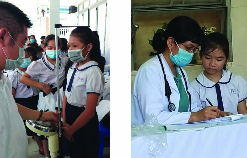Dưới sân trường sau khi đăng ký, cân đo, các em trật tự lên lầu khám nội tổng quát nhi, khám mắt, khám nhổ răng. Khám xong phòng nào, mỗi em cầm giấy đi qua khám tiếp phòng kế. Nhìn các em ở hành lang, nét âu lo, hồi hộp vẫn không che hết vẻ nhí nhảnh học trò. Nhiều em thì thào: “…mày nhìn thấy chữ to không?” - “nhổ mấy cái răng?” – “Có cắt tóc không?....