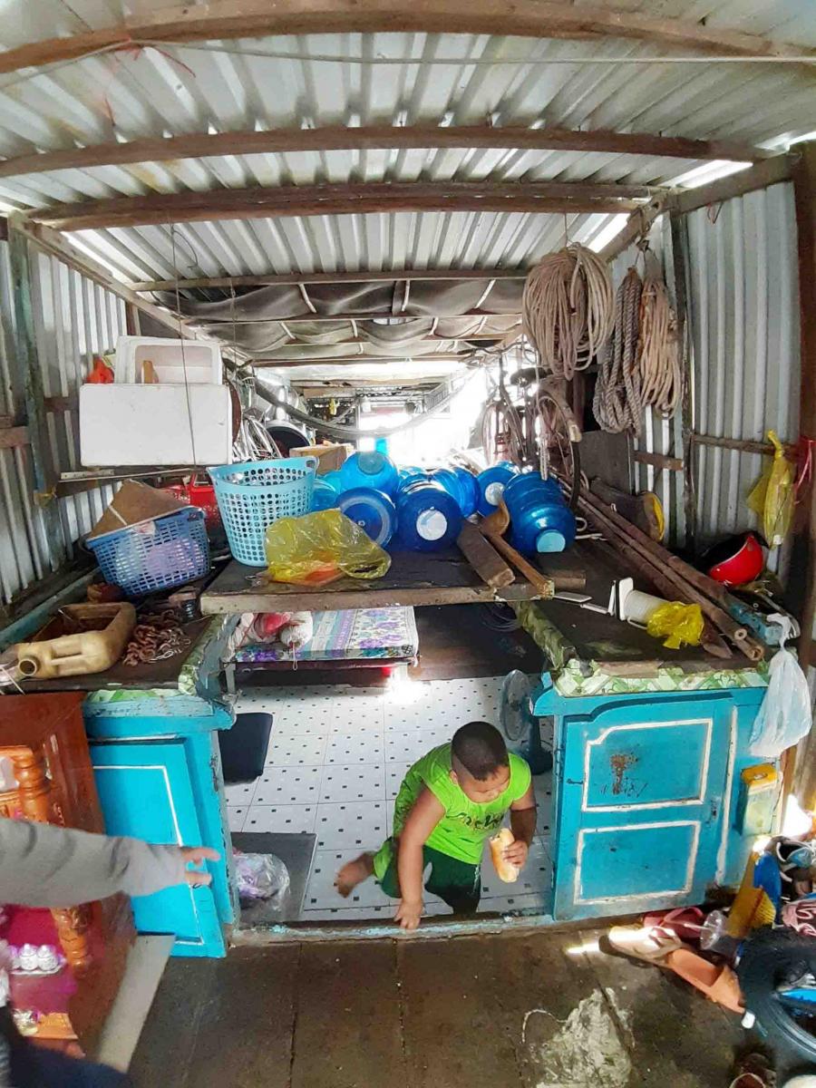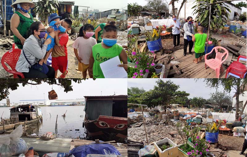 Đến nơi, khung cảnh hiện ra trước mắt chúng tôi là những bãi đất trống chất đầy bao nilon, và những chiếc xe chất đầy ve chai. Đây là xóm nghèo của khu chợ đầu mối Bình Điền. Xóm chợ nằm sát bên bờ kênh của Quận 8 với những mái nhà lụp xụp, hay nói đúng hơn là những mái thuyền được dùng để làm nơi sinh sống của những người dân nghèo khu vực này. Bước lên những mảnh ván gỗ bấp bênh, chúng tôi được một cậu bé dắt tay vào thăm “căn nhà” nhỏ tầm khoảng 3 – 4 m2 của gia đình em. Đây là “tổ ấm” của cậu. Mọi sinh hoạt của gia đình cậu đều ở trong “tổ ấm” này.