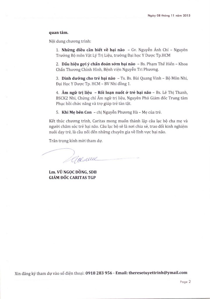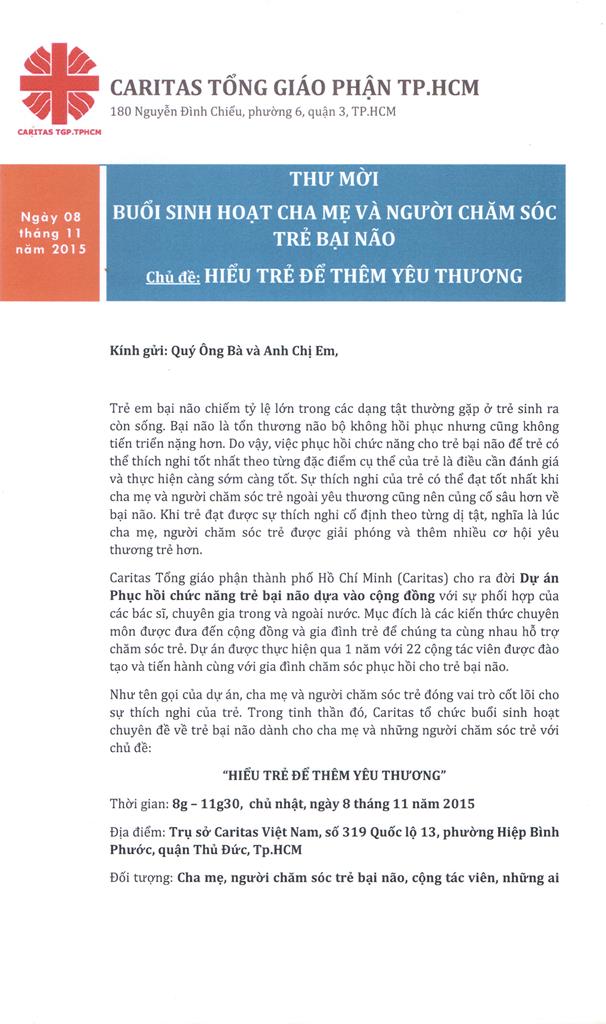 Caritas Sài Gòn: Thư mời tham dự buổi sinh hoạt dành cho cha mẹ và người chăm sóc trẻ bại não