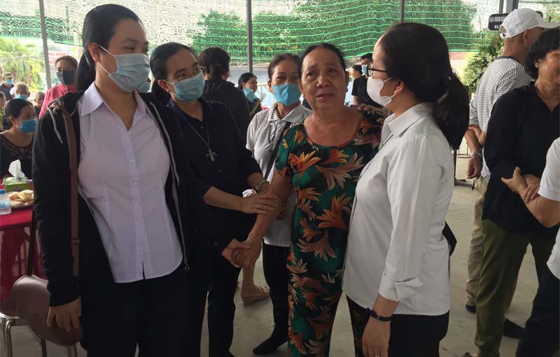 Vào lúc 9 giờ, Linh mục Vinh Sơn Vũ Ngọc Đồng, SDB – Giám đốc Caritas Sài Gòn cùng với các nữ tu, và các thành viên Caritas Giáo hạt Thủ Thiêm đã thắp nén nhang cầu nguyện cho các linh hồn trong lời kinh sốt sắng, và chia buồn, an ủi tang gia. Sự hiện diện và lời kinh cầu nguyện của Cha Vinh Sơn và mọi người trong đoàn thăm viếng là lời khẩn nguyện xin Chúa thương xót các linh hồn và những người thân trong tang quyến. Cách riêng, xin Chúa chữa lành vết thương thể xác cũng như tinh thần cho ông Lục Chấn Tâm, là người chồng, người cha, người ông trong gia đình may mắn còn sống sót, và đang chữa thương tích tại bệnh viện.