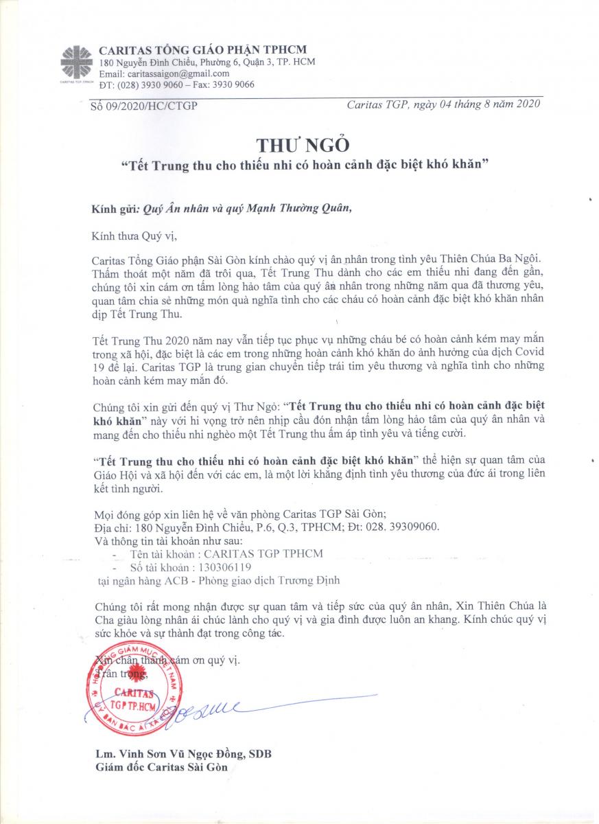 Số 09/2020/HC/CTGP Caritas TGP, ngày 04 tháng 8 năm 2020