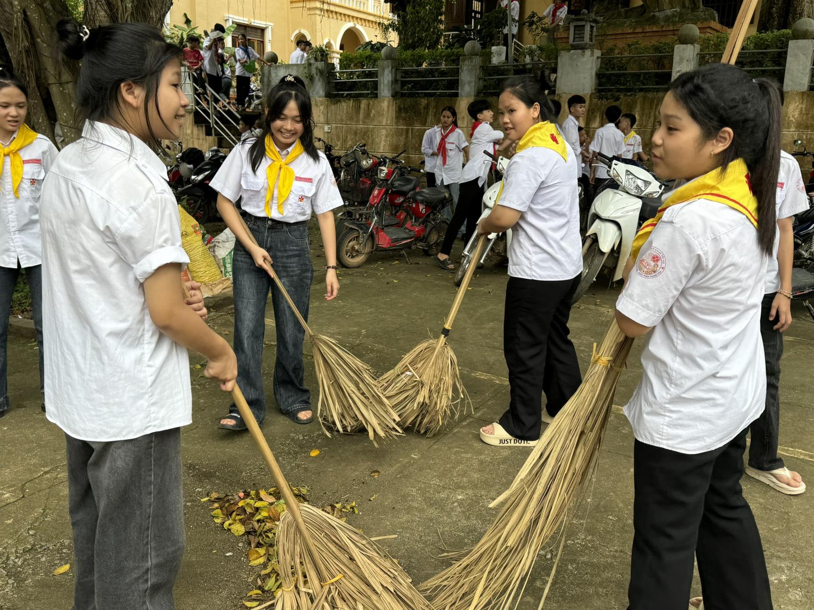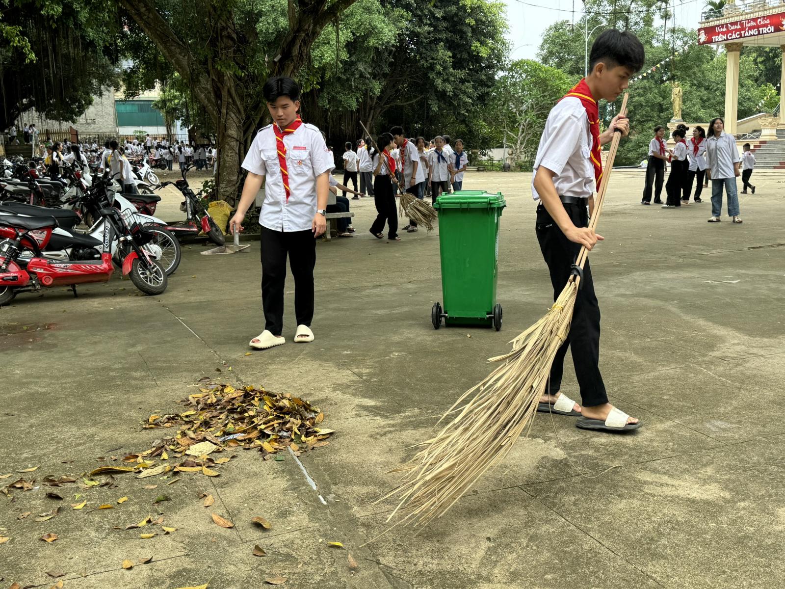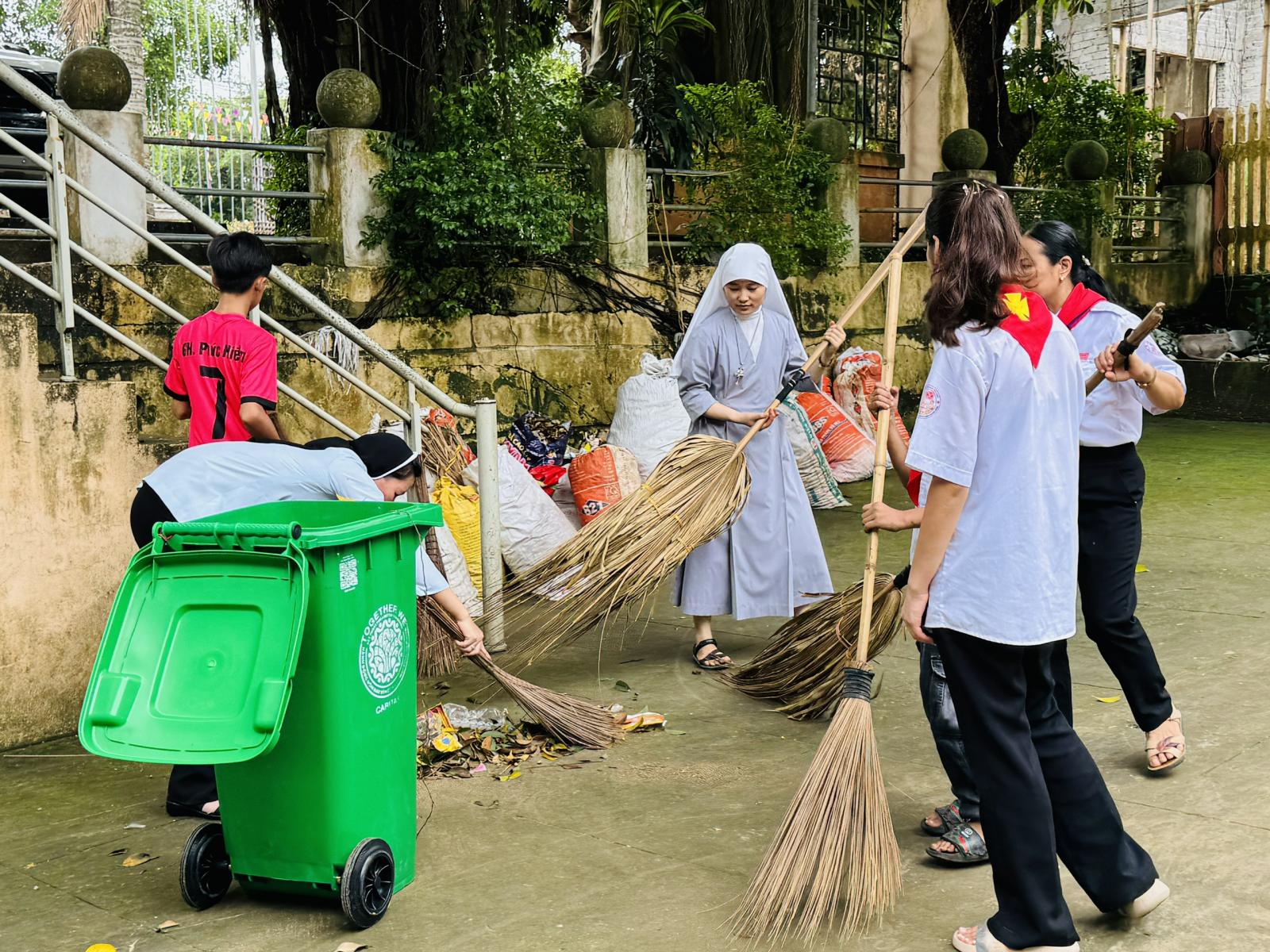 * Dọn vệ sinh môi trường: Các em thiếu nhi và huynh trưởng cùng nhau dọn dẹp khuôn viên nhà thờ, đường làng ngõ xóm, góp phần tạo môi trường sống xanh - sạch - đẹp.