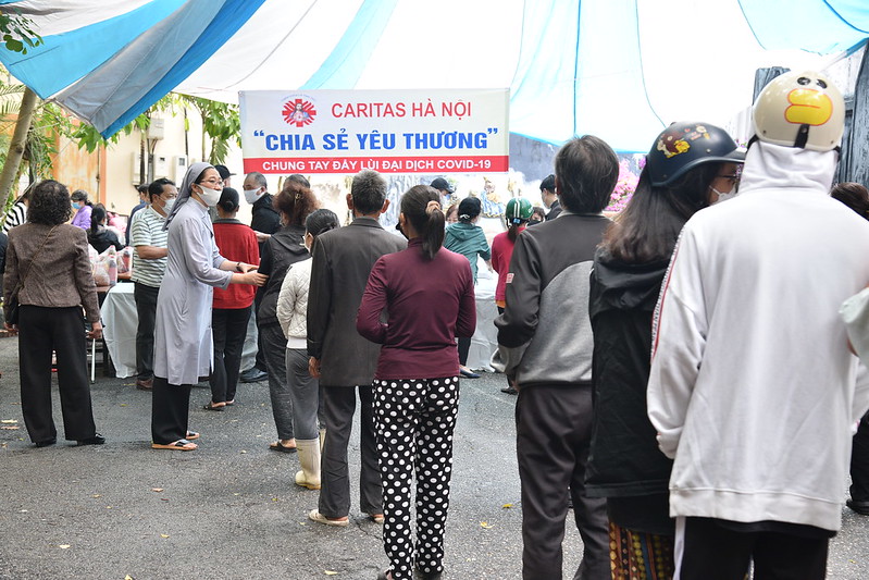 Trong thời gian diễn ra đại dịch, các Caritas của mỗi giáo phận trên cả nước đã cố gắng thực hiện những chương trình hỗ trợ cụ thể cho người dân nghèo bị ảnh hưởng bởi dịch bệnh như: cung cấp lương thực, thiết bị y tế và các nhu yếu phẩm cần thiết. Đặc biệt, nhằm hưởng ứng thư kêu gọi của Đức cha Giuse Nguyễn Chí Linh - Chủ tịch Hội đồng Giám mục gửi cho đồng bào Công giáo Việt Nam “Thương quá Sài Gòn ơi!”, một số Caritas thuộc các giáo phận đã gửi vào những chuyến hàng tiếp tế cho đồng bào tại Sài Gòn; và đưa ra những sáng kiến mới lạ như: mở siêu thị không đồng, tổ chức những “gói ăn không đồng” và “trạm nghỉ không đồng” cho bà con từ các thành phố lớn trở về quê, cung cấp thuốc tận nơi cho những hoàn cảnh đang cần đến sự trợ giúp, v.v.