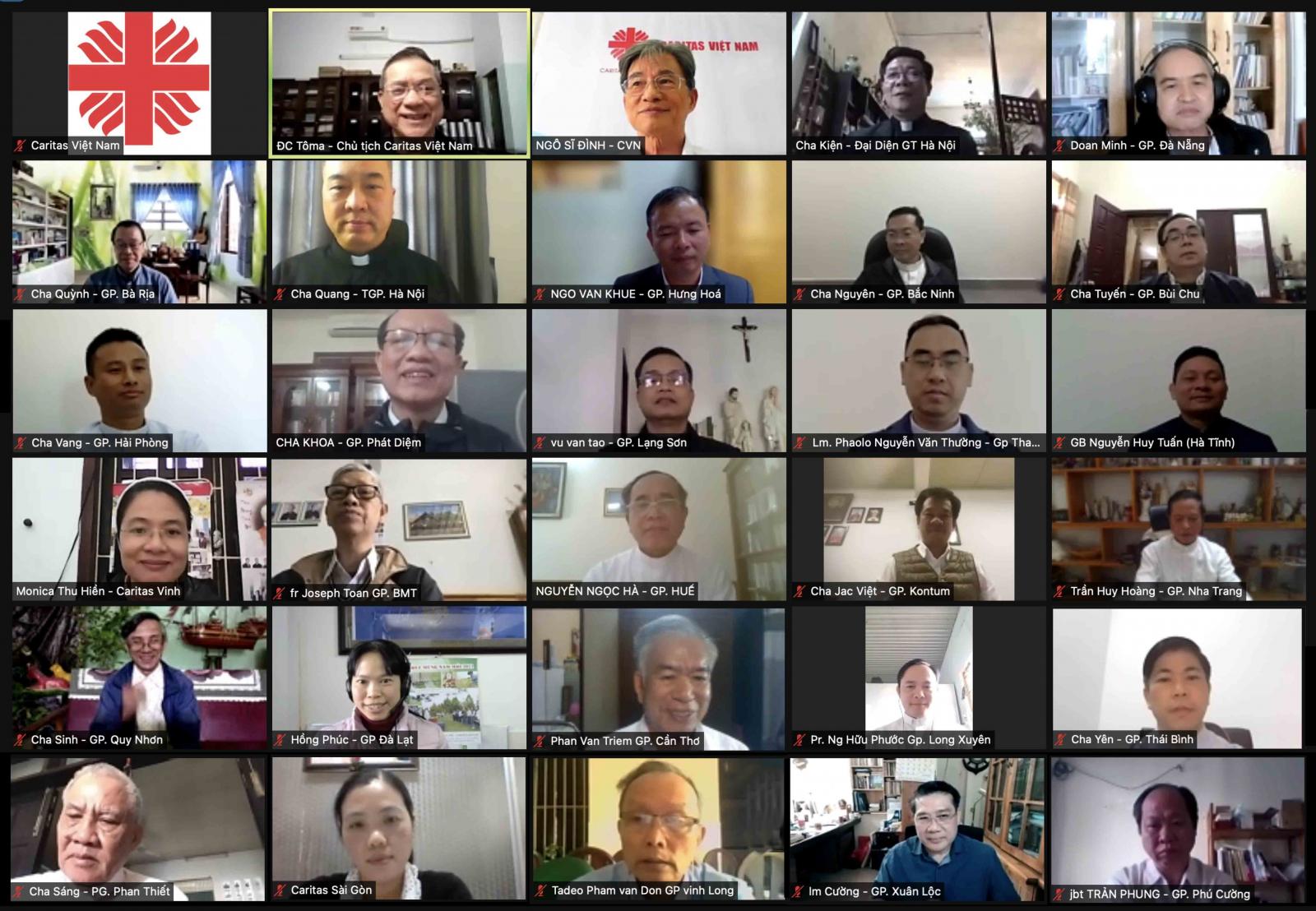Vì đại dịch Covid-19 phải thực hiện lệnh giãn cách xã hội, nên theo lời đề nghị của Đức cha Tôma Vũ Đình Hiệu - Chủ tịch Uỷ Ban Bác Ái Xã Hội - Caritas Việt Nam, vào ngày 04 tháng 12 năm 2021, văn phòng Caritas Việt Nam đã tổ chức buổi họp mặt trực tuyến nhằm chia sẻ tình hình hoạt động của 27 Caritas giáo phận trong hoàn cảnh khó khăn của dịch bệnh Covid-19.
