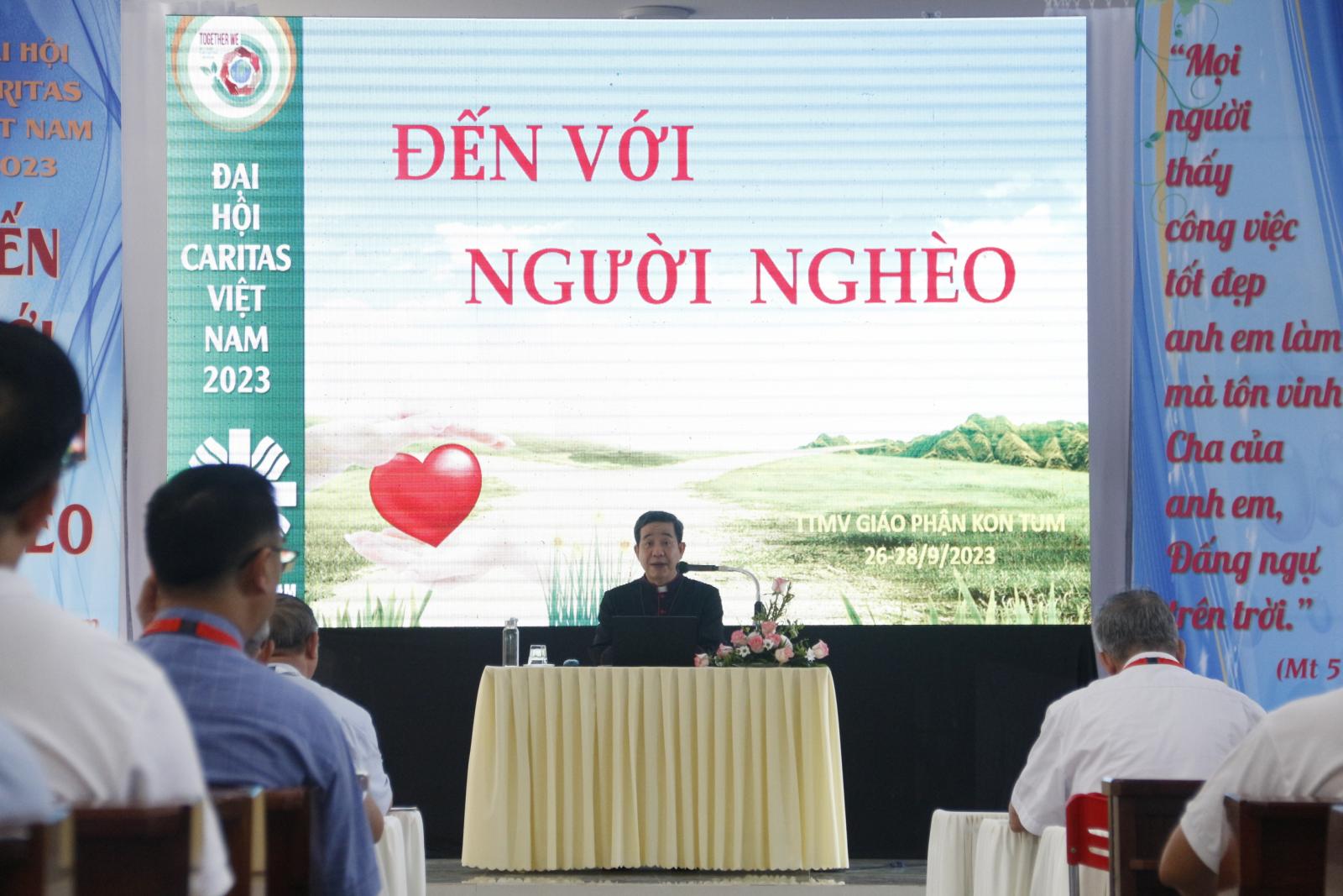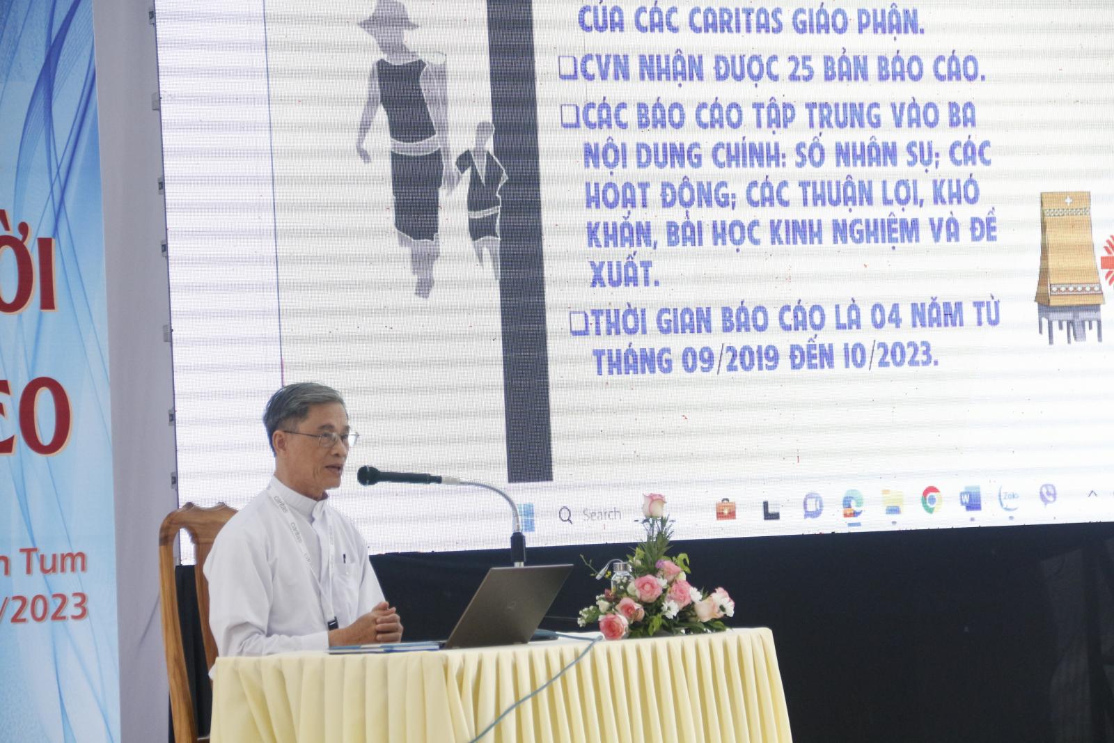 Tiếp đến, Cha Giuse Ngô Sĩ Đình, OP, Giám đốc Caritas Việt Nam báo cáo Tổng kết 4 năm về nhân sự cũng như hoạt động của Caritas Việt Nam trên toàn quốc từ năm 2019 - 2023. Báo cáo cho biết Caritas trên toàn quốc có 245 nhân viên văn phòng; 131.360 Hội viên các Giáo phận; 30.367 Cộng tác viên và Tình nguyện viên. Các hoạt động gồm Cứu trợ khẩn cấp và tái thiết, Chăm sóc và Hỗ trợ người nghèo, đặc biệt hỗi trợ người nghèo trong thời gian đại dịch Covid-19; Hỗ trợ người có HIV/AIDS; Hỗ trợ Người khuyết tật/Người phong; Phòng chống buôn người; Chương trình trao học bổng “Con Đường Sáng”; Chiến dịch “Togther We” Chúng ta Cùng nhau chăm sóc thiên nhiên và chăm sóc con người; Xây dựng mạng lưới Caritas Việt Nam.