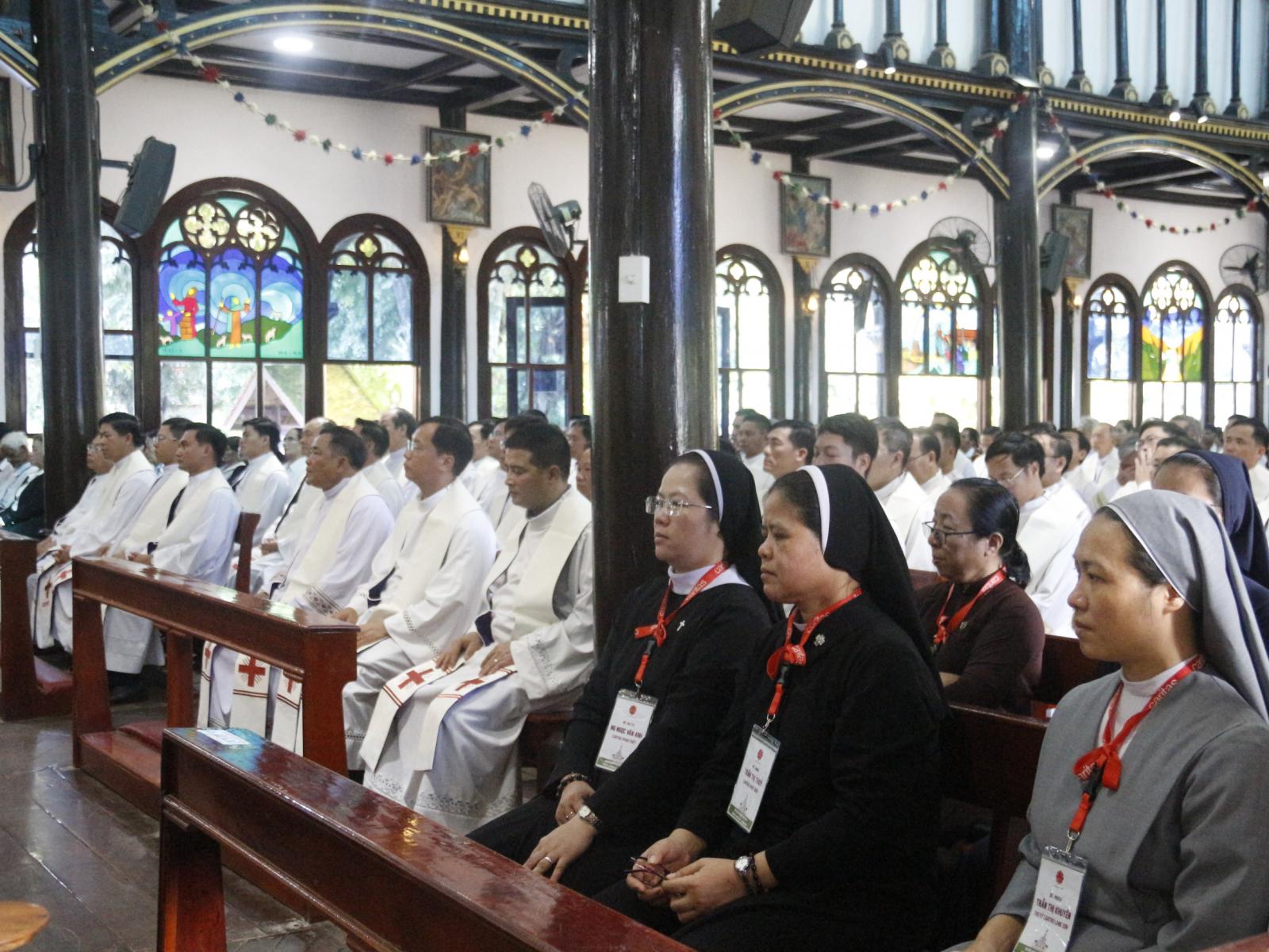Đúng 8g00, quý Đức cha, quý Cha, quý Đại biểu và khách mời qui tụ tại Nhà Thờ Chánh Tòa Kon Tum để tham dự Thánh Lễ Khai mạc do Đức Cha Tôma chủ tế. Trong bài giảng, Đức cha nhấn mạnh đến 'Đức ái', đó là nhân đức quan trọng và sống còn trong cuộc sống của mỗi người. Đức cha diễn giải đến Bài ca Đức ái của thánh Phaolô (1Cr 13) và ngài mời gọi các thành viên Caritas khi làm việc bác ái thì làm với tấm lòng chân thành, vui vẻ và tự nguyện. Với bài Tin mừng 'Dụ ngôn người Samaritanô Nhân hậu', Đức cha mời gọi mỗi thành viên hãy trở nên người thân cận với những người dễ bị tổn thương, người nghèo khổ đang cần đến sự phục vụ của mỗi người. Và chúng ta chỉ có thể kính trọng người nghèo với đức tin mà chính Chúa Giêsu đã đồng hoá với người bé nhỏ nhất, người đói khát, người không có áo mặc (Mt 28). Hình ảnh Đức Kitô đói khát vẫn đang hiện diện và còn rất nhiều xung quanh chúng ta. Vì thế chúng ta hãy ra đi và đến với họ.
