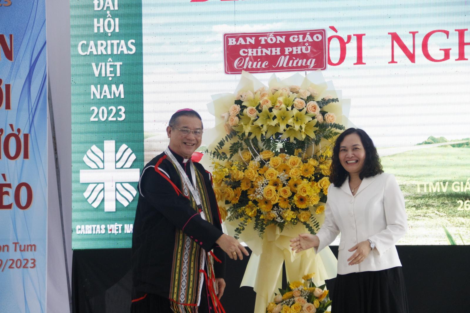 11g15, Đại Hội hân hoan chào đón các vị khách Chính quyền từ Trung ương đến địa phương. Dẫn đoàn, bà Đào Thị Đượm, Phó phòng Công giáo, đại diện Ban Tôn giáo Chính phủ đọc thư chúc mừng và trao tặng lẵng hoa của ông Vũ chiến Thắng - Thứ trưởng Bộ nội vụ. Trong thư ông bày tỏ sự nuối tiếc không thể đến Đại Hội. Ông đánh giá cao những công việc bác ái của Caritas đã làm cho người nghèo. Đây là những giá trị yêu thương, tôn trọng phẩm giá con người, phù hợp với chủ chương của đất nước đề ra đó là 'không ai bị bỏ lại phía sau'. Kế đó là trao tặng các lẵng hoa chúc mừng từ Ban Tôn giáo Chính phủ cũng như quý vị đại diện cho Chính quyền Tỉnh và Thành phố Kon Tum.