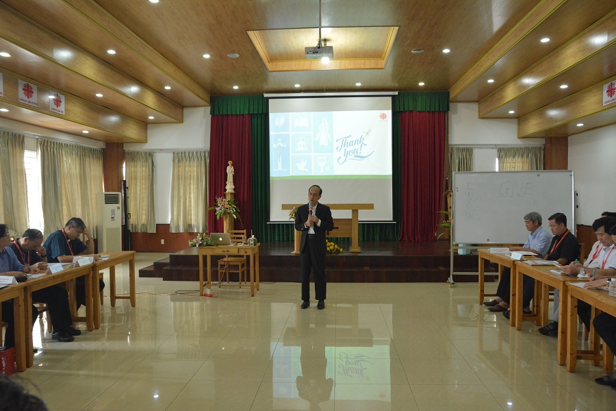 Trong buổi sáng của ngày đầu tiên tập huấn, cha Marcello Đoàn Minh, đại diện Giáo tỉnh Huế trình bày về “Caritas Việt Nam, 15 năm, một sứ mệnh, một con đường”. Dựa trên những gợi ý suy niệm của Sư huynh Yesudas, thuộc dòng Thừa Sai Bác Ái của Thánh Têrêxa Calcutta, cha Marcello nhắn nhủ mọi thành viên trong đại gia đình Caritas khi dấn thân phục vụ họ không phải là nhân viên xã hội, nhưng trên hết mọi sự chính là sự hiện diện, là tình yêu và lòng nhân từ của Chúa cho người nghèo.