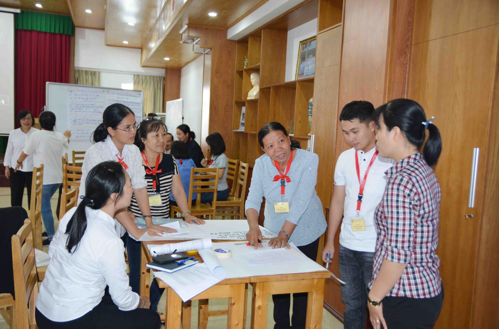 Thảo luận nhóm là những điểm son của khoá tập huấn. Đây là cơ hội để các tập huấn viên cùng nhau làm bài tập, học hỏi chia sẻ kinh nghiệm lẫn nhau. Ban đầu, khi làm việc nhóm các học viên còn e dè, “ngại làm sai, phát biểu không đúng”, nhưng kể từ ngày tập huấn thứ hai, giờ thảo luận của các nhóm đã trở nên sôi nổi, bởi được khuyến khích: mỗi người - ở vị thế người học - đều có “quyền nhầm lẫn” khi đóng góp ý kiến.