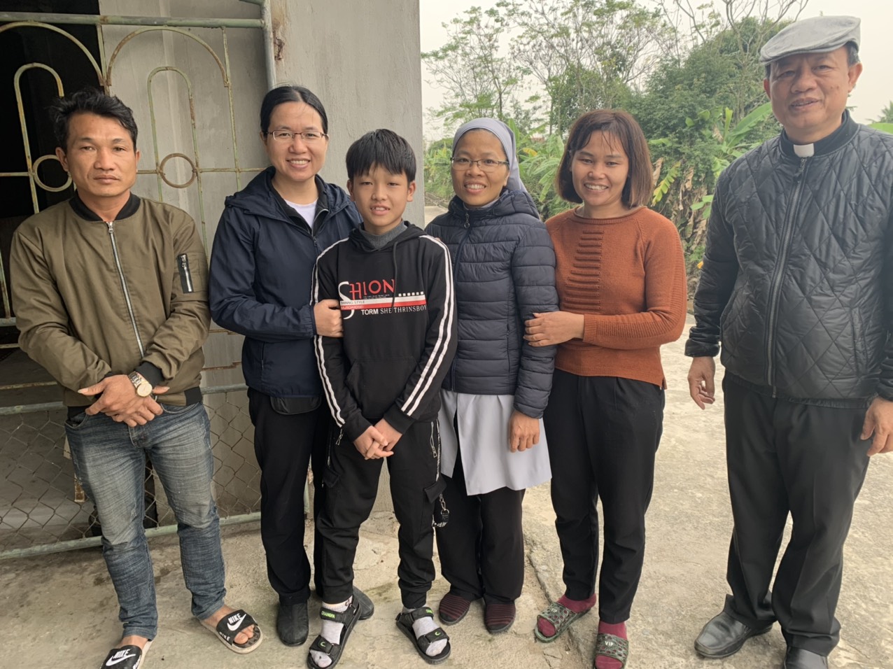 Chiều đến, cha Gioan Đỗ Văn Khoa, Giáo đốc Caritas Phát Diệm cùng chúng tôi đến thăm gia đình cháu Trần Quang Trường, 14 tuổi. Cháu Trường bị Viêm Cơ Tim Cấp, do vậy cháu đã trải qua nhiều tháng để phẫu thuật và điều trị tại bệnh viện. Đến gặp cháu, chúng tôi thấy cháu đã khỏe hơn rất nhiều so với lúc chưa phẫu thuật và điều trị bệnh tim. Cháu lên cân nhiều hơn và da không còn bị thâm tím. Ba mẹ cháu chỉ biết tạ ơn Chúa vì cháu vẫn còn sống và cám ơn thật nhiều đến tất cả quý ân nhân đã giúp gia đình vượt qua thời gian khó khăn nhất. Hiện tại, chân phải của cháu chưa đi lại bình thường cần phải điều trị Đông Y nhiều hơn do di chứng của những lần phẫu thuật, ghép phổi và chạy thận.