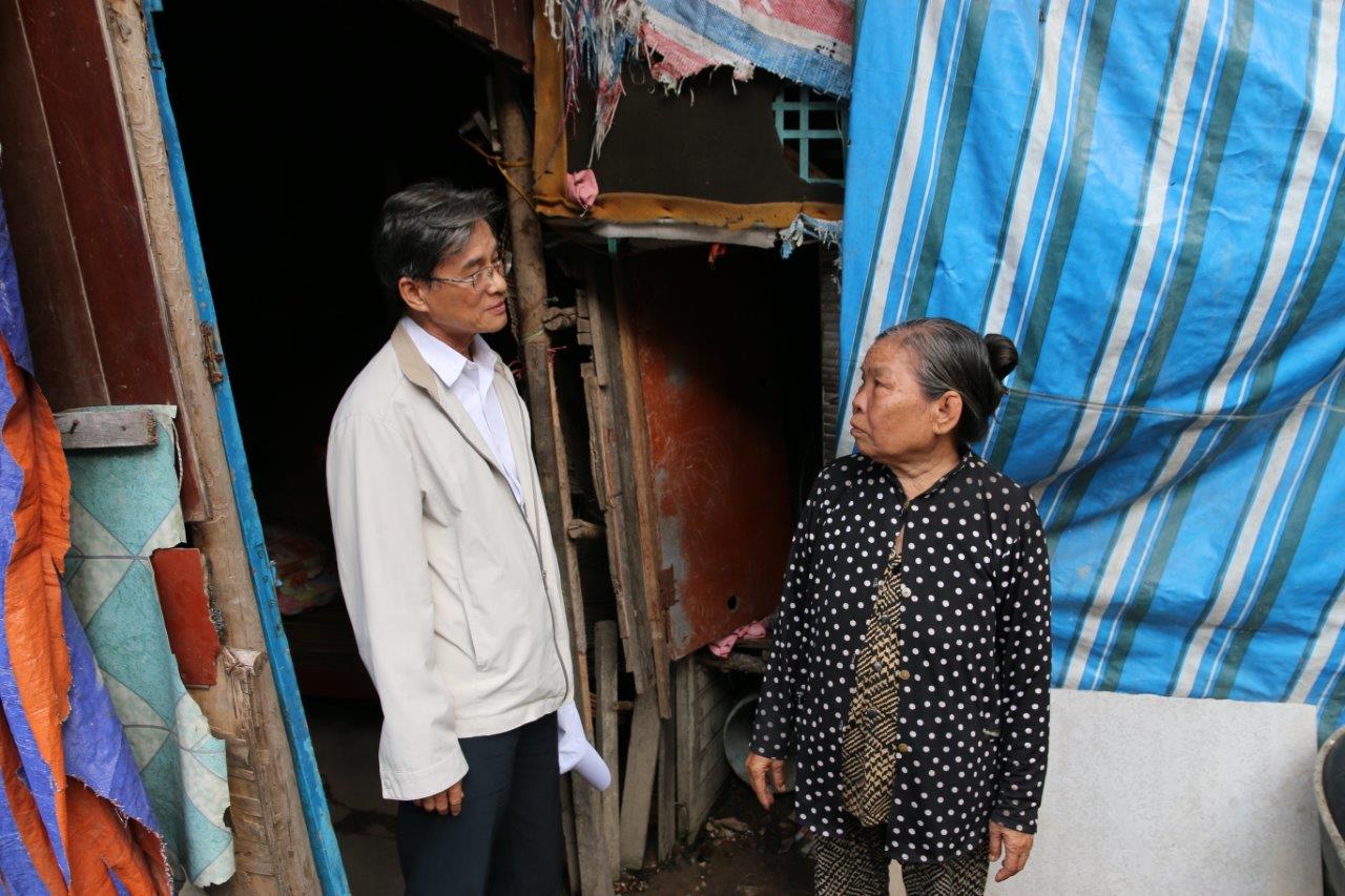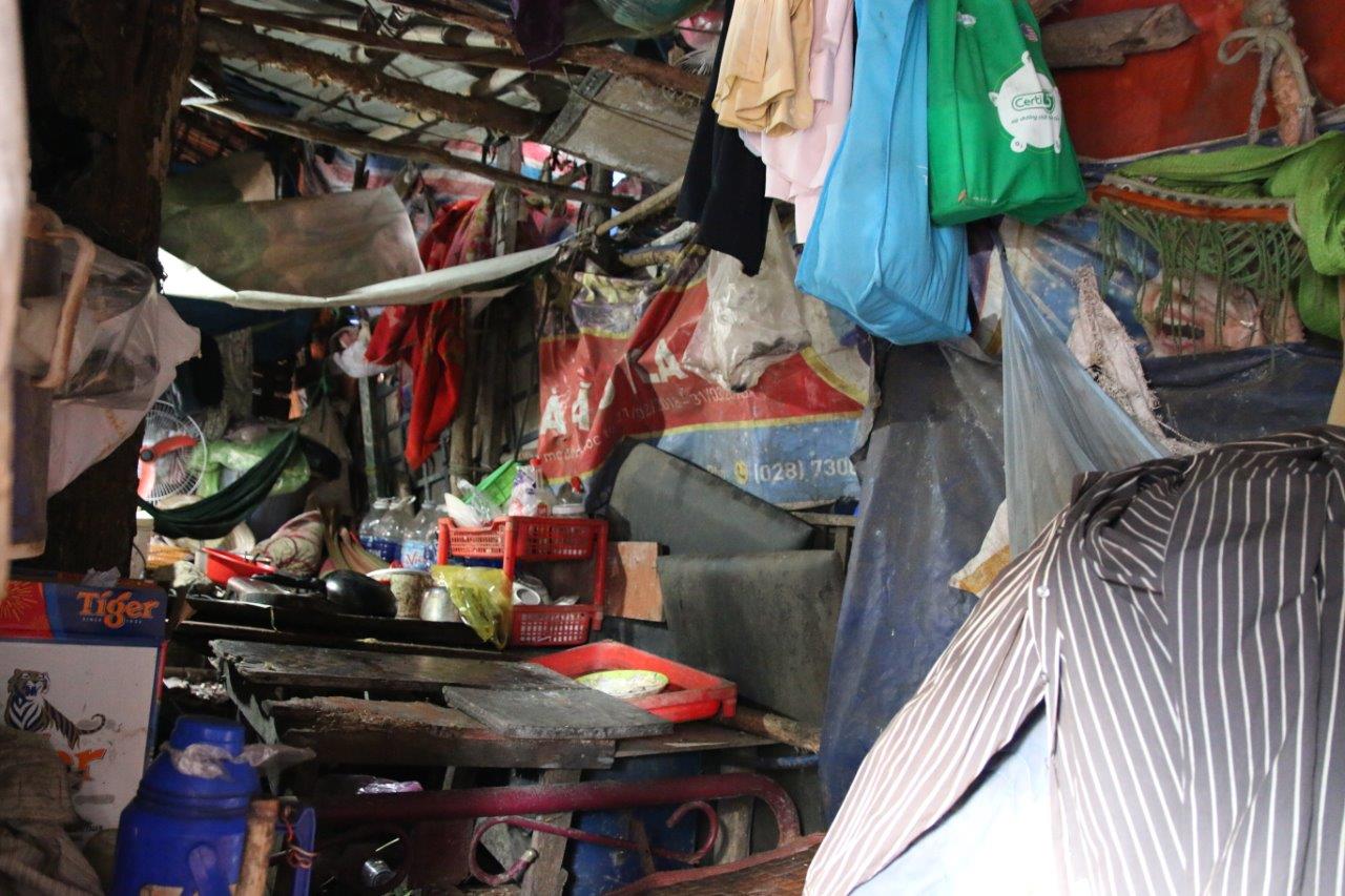 Đến được gia đình ông bà N. V. H, ở Tam Bình, Thủ Đức, TP. HCM, chúng tôi phải đi qua con đường trơn trượt, đất đá lổm cổm và không có ánh sáng của điện, nước sạch và Internet. Nơi đây là một bãi đất trống, sình lầy và ngập lụt mỗi khi thủy triều hoặc mưa bão. Nhà ở của họ là một căn chòi được bao phủ bởi những tấm bạt nhựa và ván ép chắp vá do nhóm tình nguyện viên làm cho. Để vào được bên trong căn chòi của ông Hến là phải cúi rạp người xuống mới chui qua được cửa, và bên trong chỉ có một chiếc giường cũ kỹ, xiêu vẹo với tất cả các vật dụng của gia đình được chất lên đó. Chiếc giường còn là góc nấu ăn của ông bà mỗi ngày, bởi ngoài chiếc giường ra thì chẳng còn khoảng trống nào trong căn chòi chắp vá này.