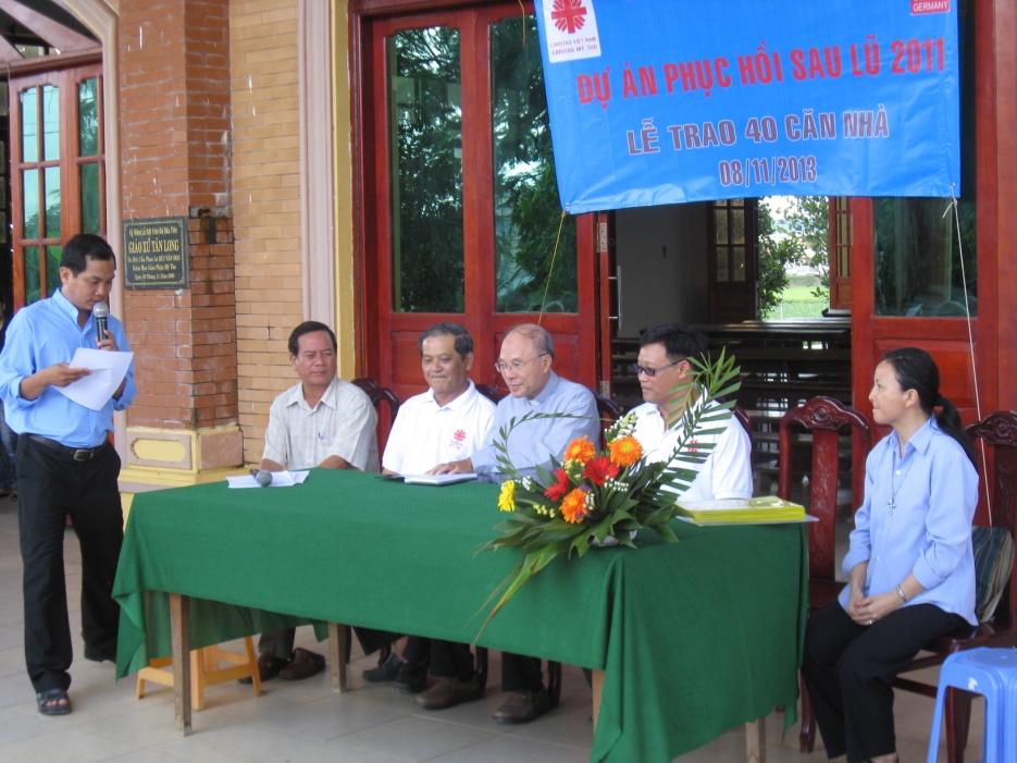 Cha Giám đốc Caritas Mỹ Tho chia sẻ những bước đi đầy khó khăn của dự án, từ thời cha Giuse Nguyễn Minh Hoàng năm 2011 cho đến cha Gioan Baotixita Nguyễn Trung Hiếu là người đã hăng hái nhiệt tình thực hiện. Cha cũng cám ơn Caritas Việt Nam và Caritas Đức đã hỗ trợ dự án và chia vui cùng 40 hộ được trao nhà hôm nay. Cha đã long trong tuyên bố nghi thức trao nhà.