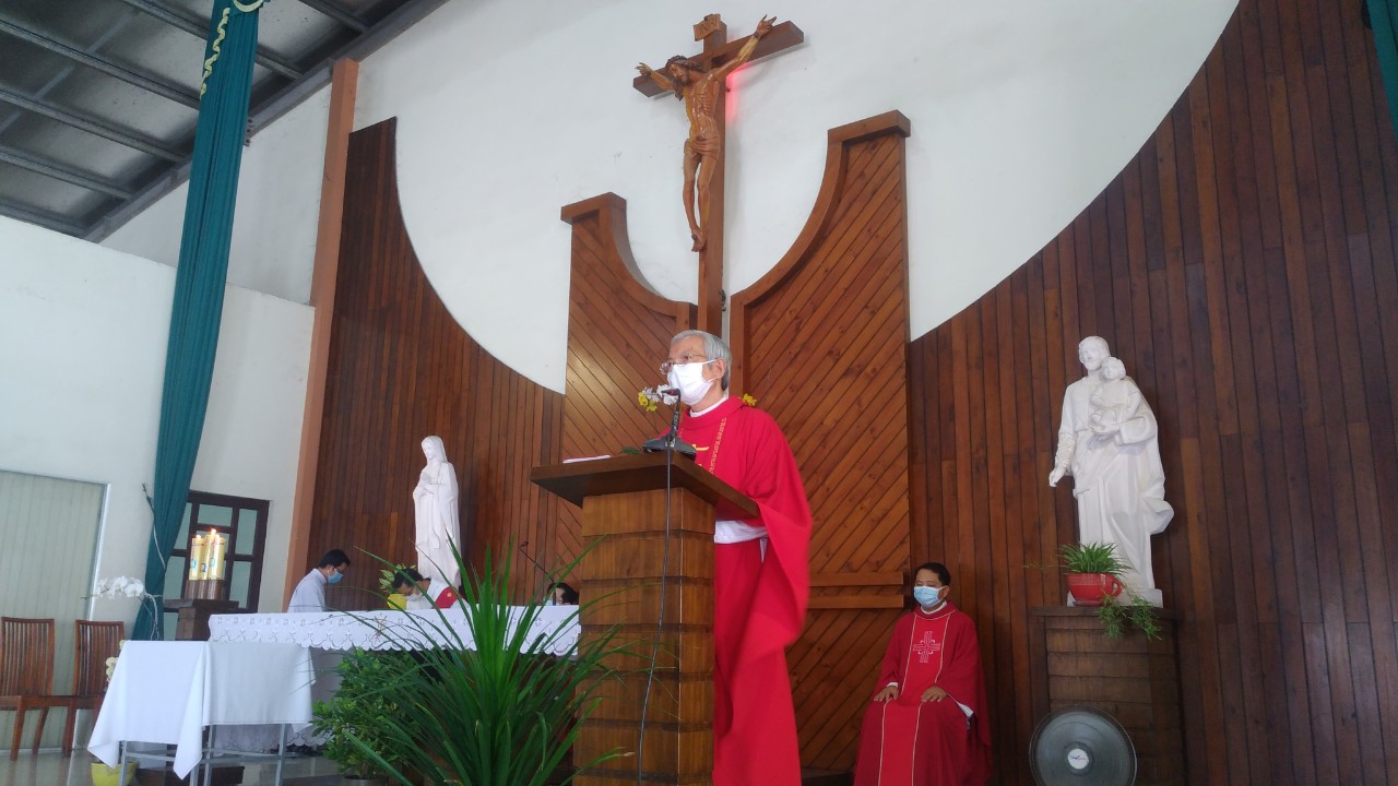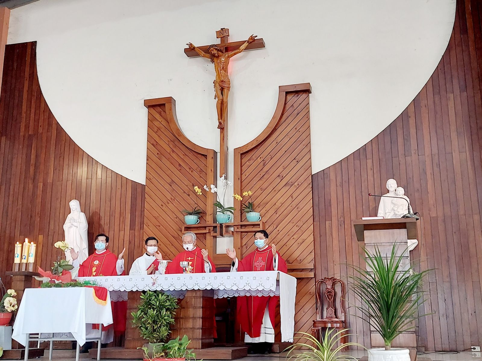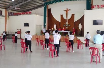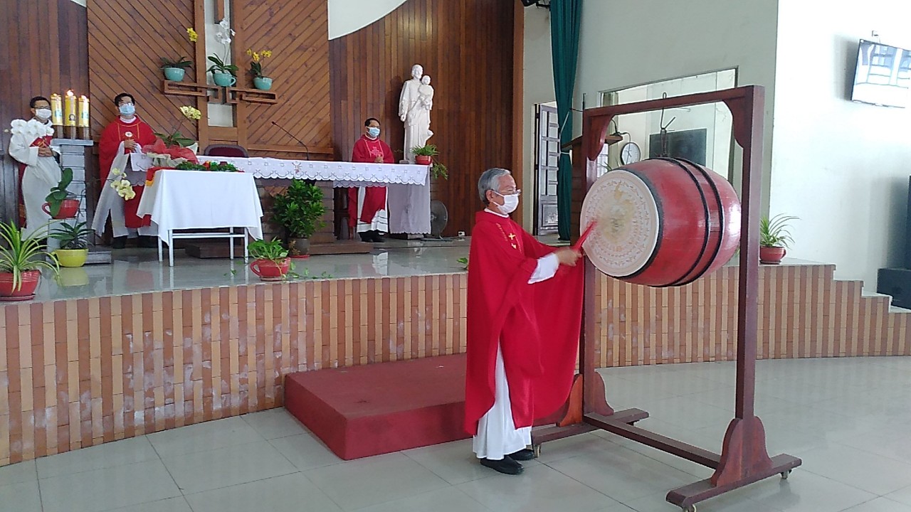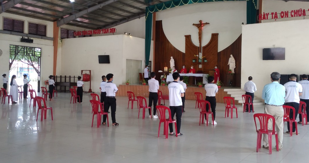 Trong tình hình chung của xã hội đang chịu giãn cách để phòng dịch Covid-19, số người tham dự thánh lễ rất hạn chế. Chỉ có đại diện nhà trường, gồm: Cha Hiệu trưởng, quý cha, quý thầy, quý dì, và một số thầy cô giáo, nhân viên, học sinh sinh viên đã ở trường từ cuối tháng 5 vừa qua.