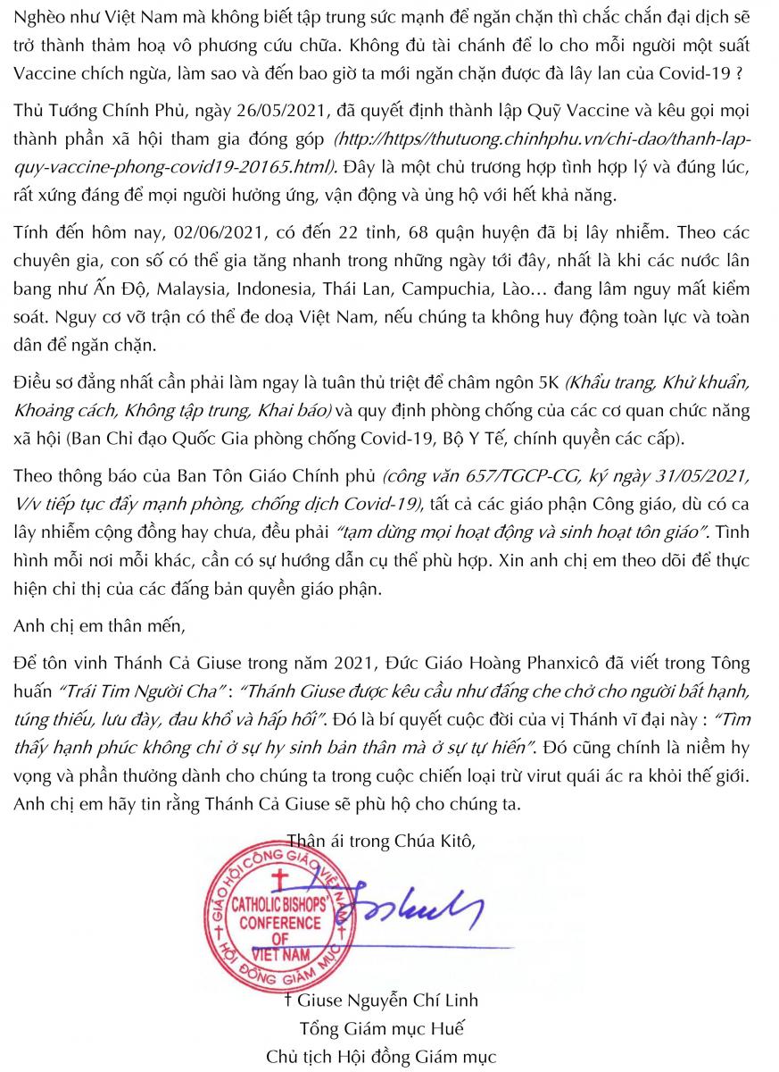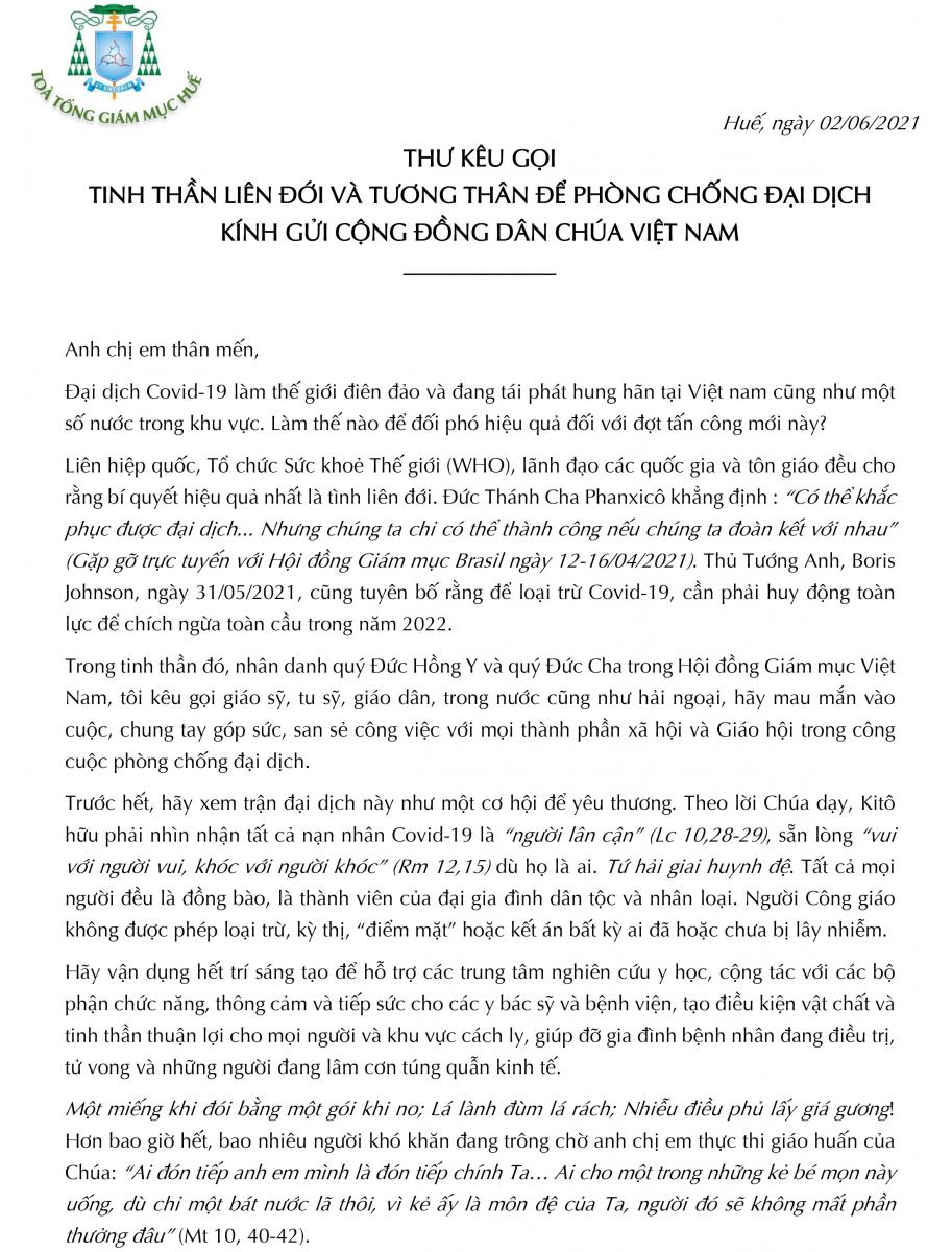 Trong tinh thần đó, nhân danh quý Đức Hồng Y và quý Đức Cha trong Hội đồng Giám mục Việt Nam, tôi kêu gọi giáo sỹ, tu sỹ, giáo dân, trong nước cũng như hải ngoại, hãy mau mắn vào cuộc, chung tay góp sức, san sẻ công việc với mọi thành phần xã hội và Giáo hội trong công cuộc phòng chống đại dịch.