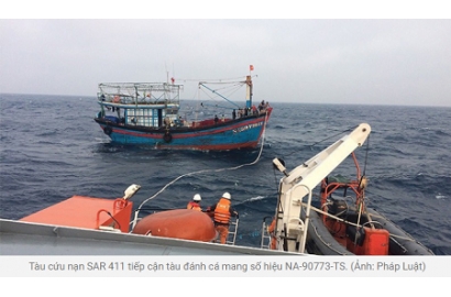 Chiều tối 23/4, sau hơn 10 giờ hành trình xuyên qua khu vực chịu ảnh hưởng của gió mùa mạnh, điều kiện khắc nghiệt của thời tiết trên biển, tàu cứu nạn hàng hải SAR 411 đến đã tiếp cận tàu cá NA 90773 TS bị nạn từ ngày 19/4.