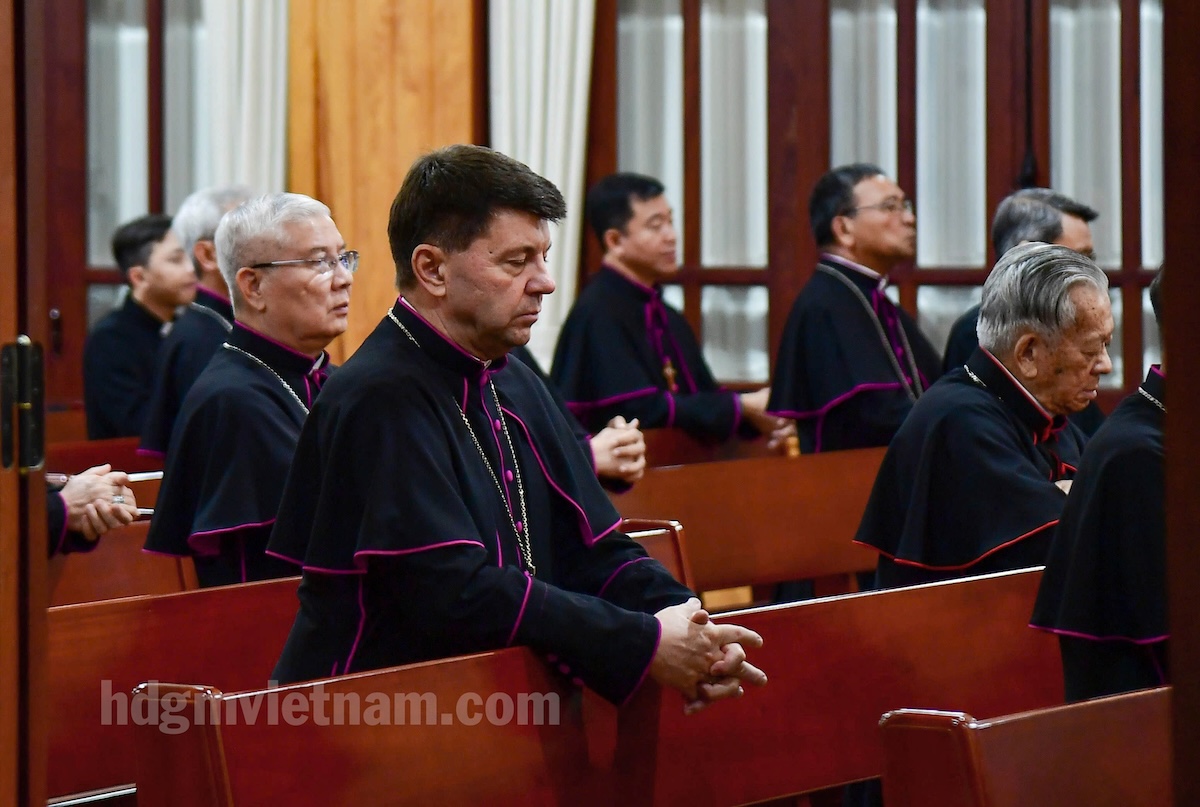 WHĐ (08/10/2025) - Sáng ngày 08 tháng 10, toàn thể quý Đức cha của 27 giáo phận cùng với Đức Tổng Giám mục Marek Zalewski, Đức Hồng y Phêrô Nguyễn Văn Nhơn, và Ban Thư ký Đại hội XVI đã quy tụ tại Nhà nguyện Toà Giám mục Đà Lạt lúc 5g30 để cử hành Phụng vụ Giờ Kinh Sáng, sau đó Đức cha Giuse Đỗ Mạnh Hùng đã chủ tế Thánh lễ, dâng ngày làm việc thứ II của Đại hội dưới sự bảo trợ của thánh Giuse.