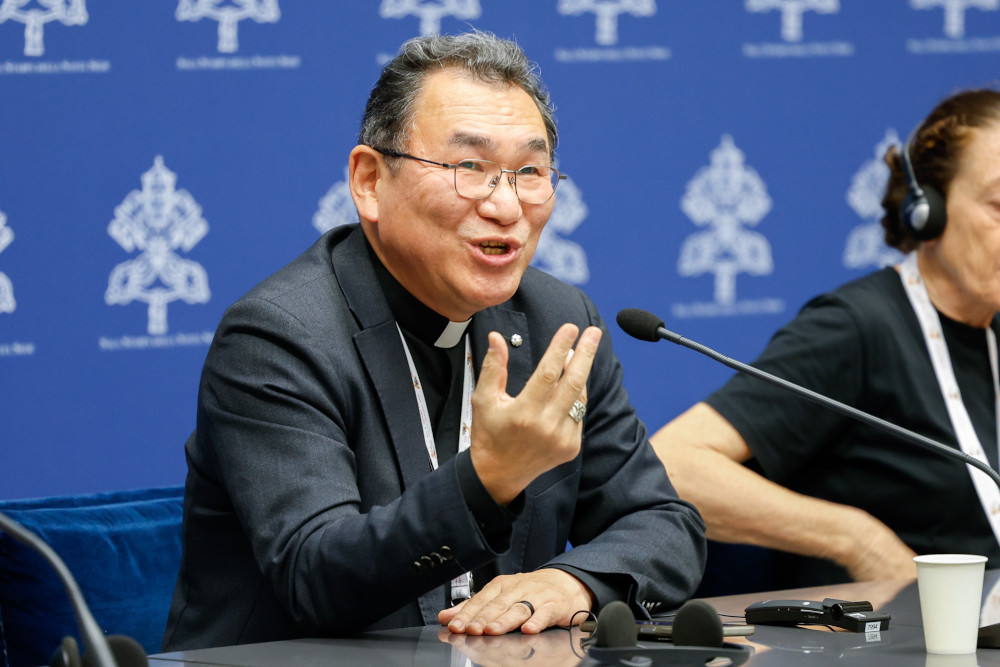 Đức Tổng Giám mục Tarcisio Isao Kikuchi của Tổng Giáo phận Tokyo phát biểu trong cuộc họp báo về phiên họp của Thượng Hội đồng Giám mục tại Vatican ngày 20 tháng 10 năm 2023. (Ảnh: Lola Gomez/CNS.)