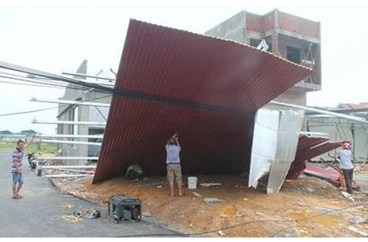 Mái nhà của một hộ dân bị bão giật tung, đổ đè lên đường dây điện. Ảnh: Đức Hùng. |